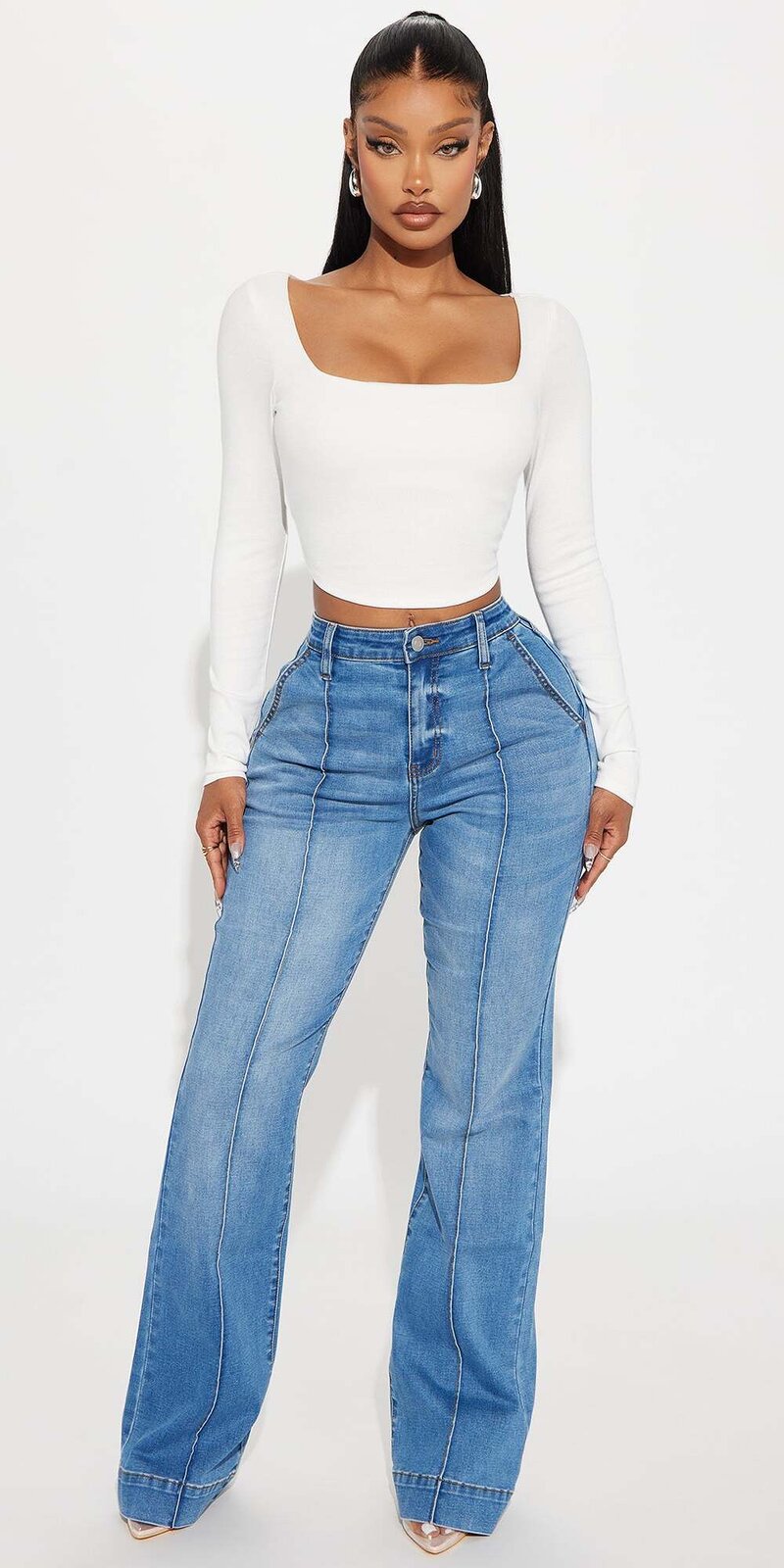 Štýlový biely crop top s dlhým rukávom a moderným štvorcovým výstrihom. Rebrovaná elastická tkanina zvýrazňuje postavu a poskytuje pohodlie pri nosení.