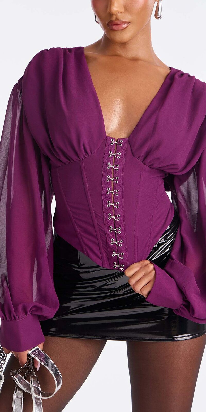 Elegantný korzetový top zo vzdušného šifónu v bordovej farbe, ktorý očarí jemným riasením a ženským strihom. Spevnená konštrukcia s háčikovým zapínaním dodáva luxusný vzhľad aj istotu pri nosení.