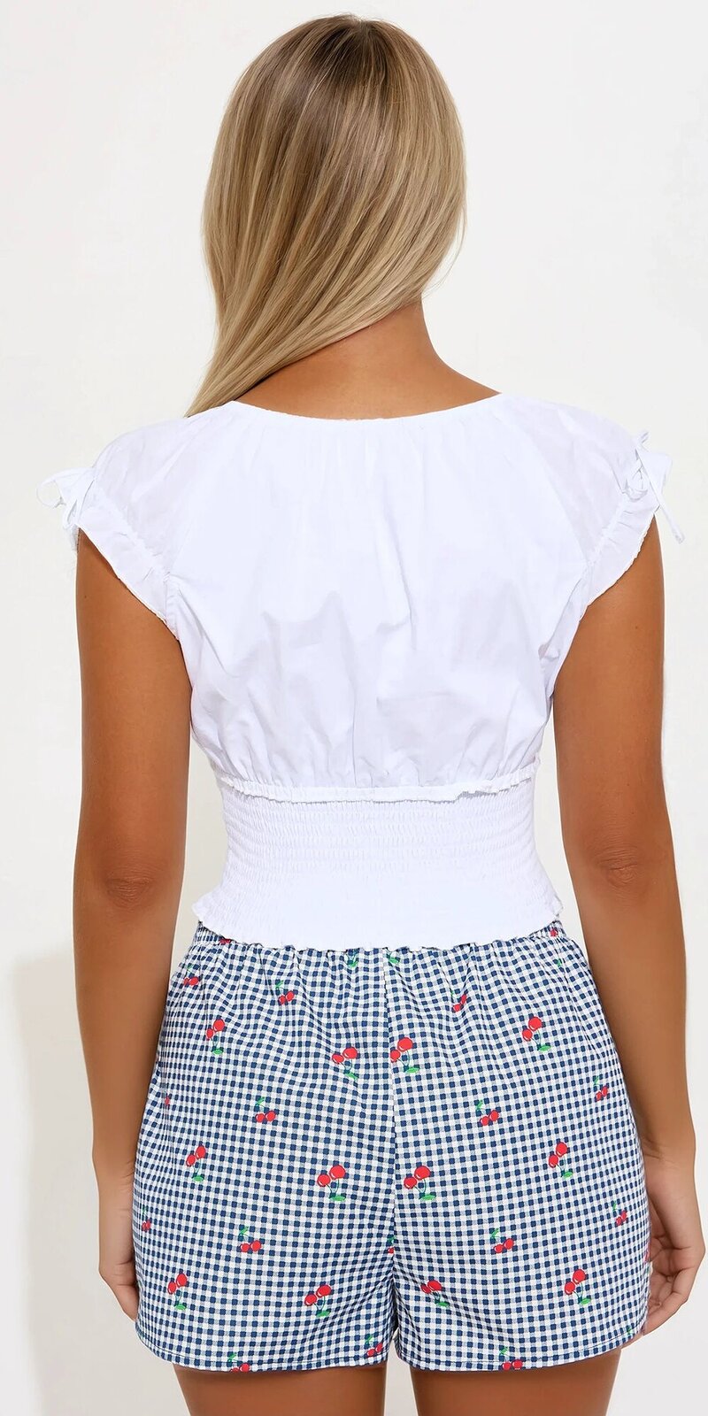 Biely krátky top s viazaním je štýlovou voľbou, ktorá spája jemnosť, ženskosť a módnu eleganciu do jedného výrazného celku.