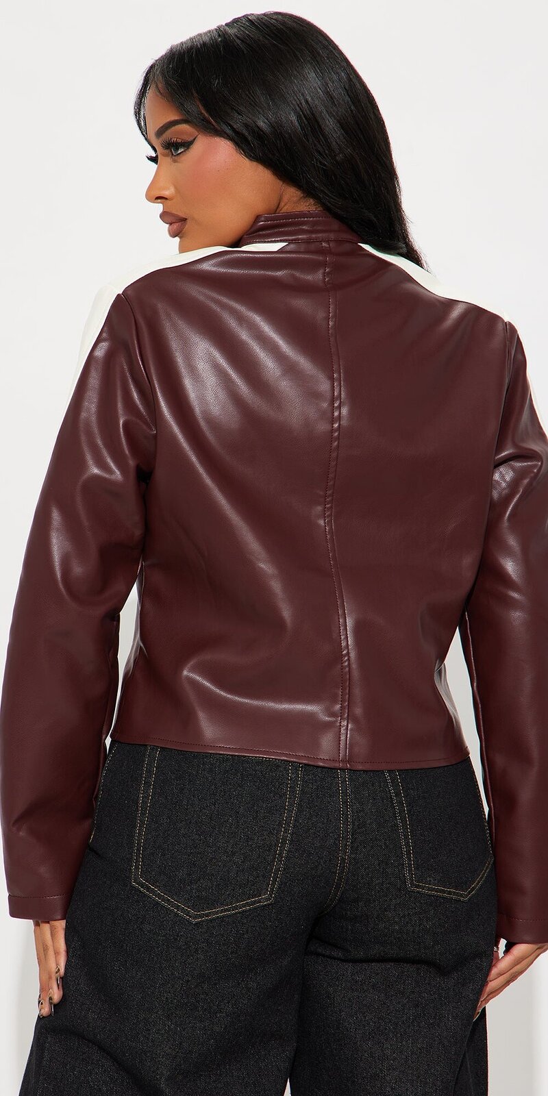 Motorkársky strih s výrazným golierom a tvarovanými ramenami vytvára silnú siluetu, zatiaľ čo hladký povrch umelej kože pôsobí luxusne a sofistikovane. Bordová farba dodáva bunde exkluzívny a štýlový akcent.