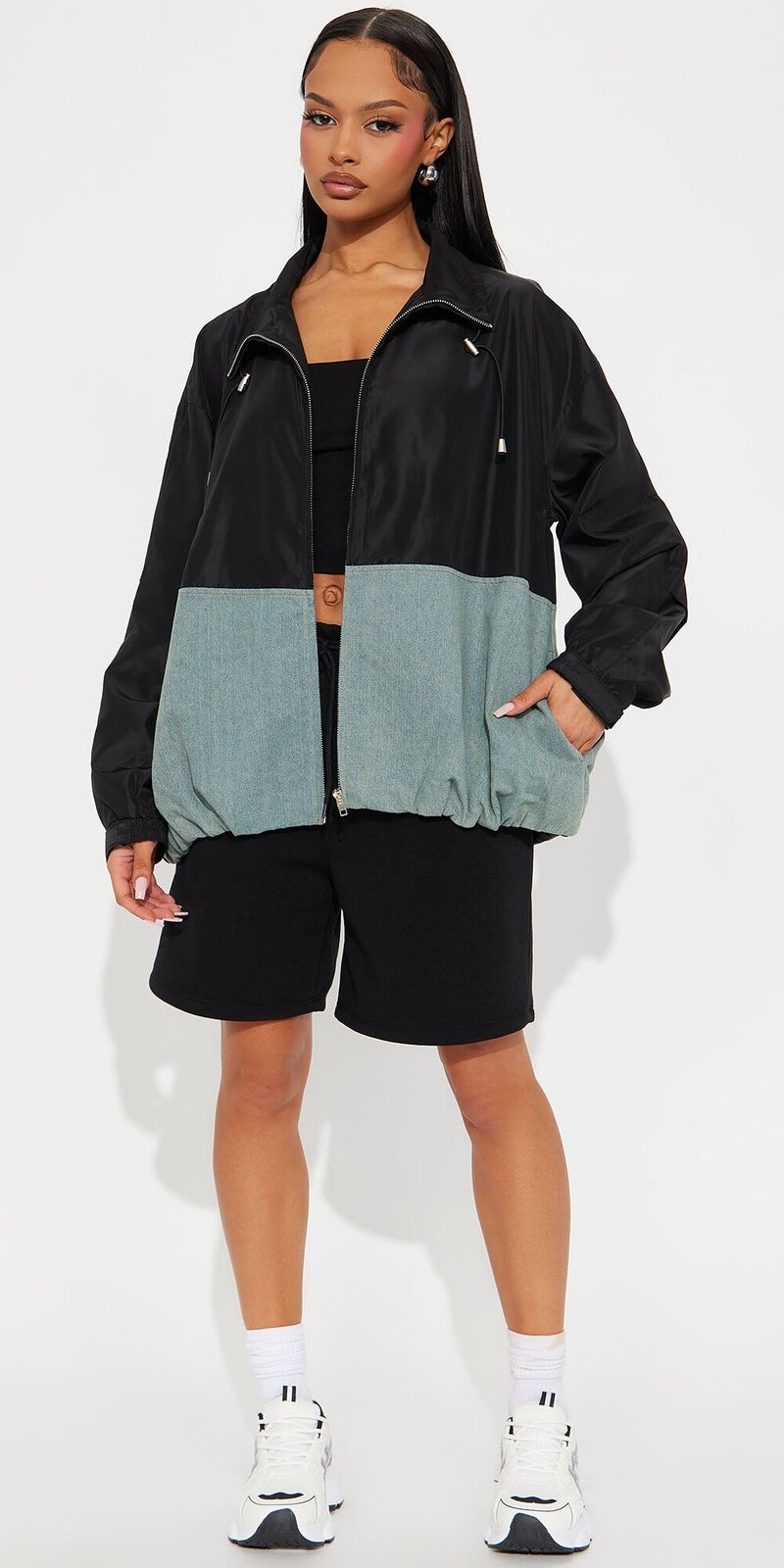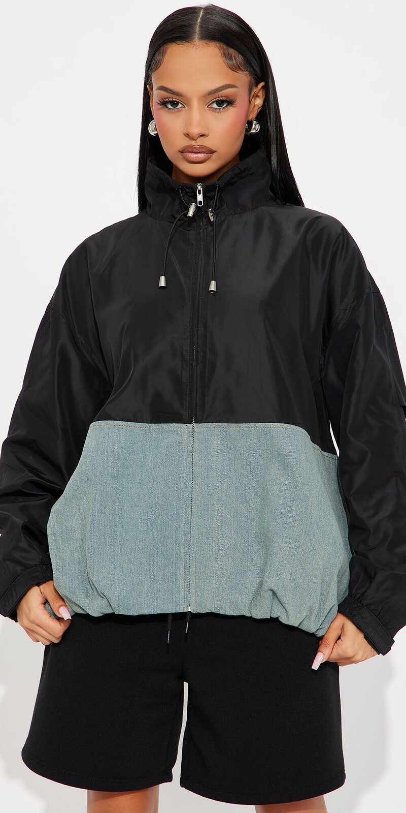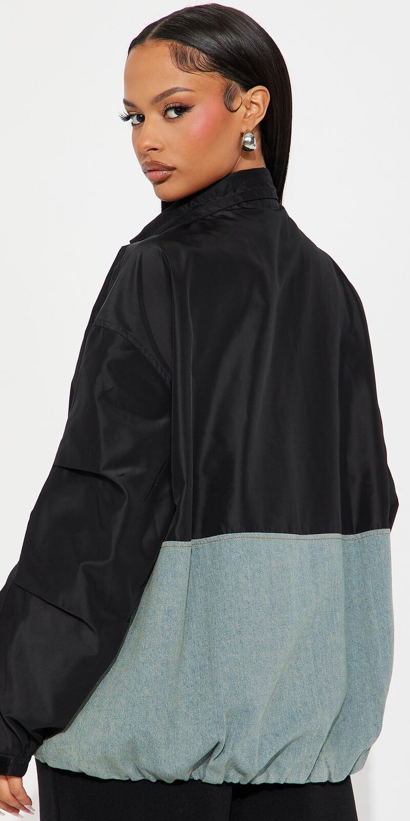 Táto čierno-denimová vetrovka s farebnými blokmi predstavuje moderný mestský štýl v prémiovom prevedení. Kombinuje lesklý polyesterový materiál s denimovými panelmi, ktoré dodávajú bunde jedinečný charakter a kontrastnú textúru.