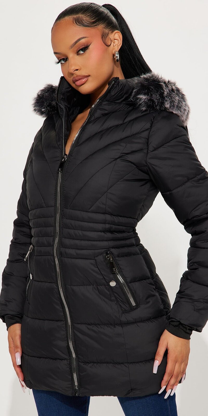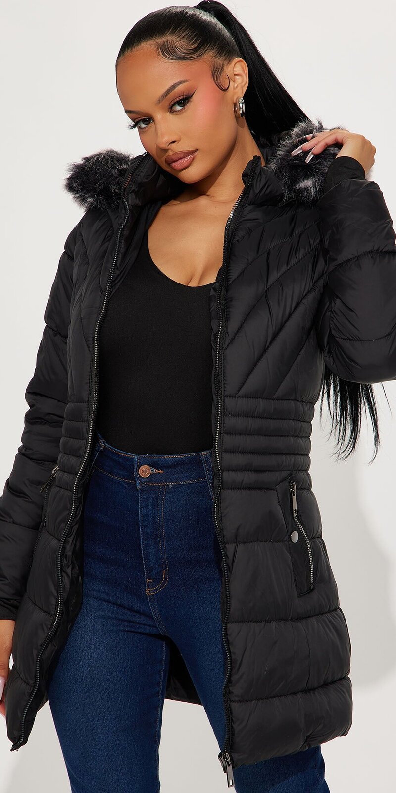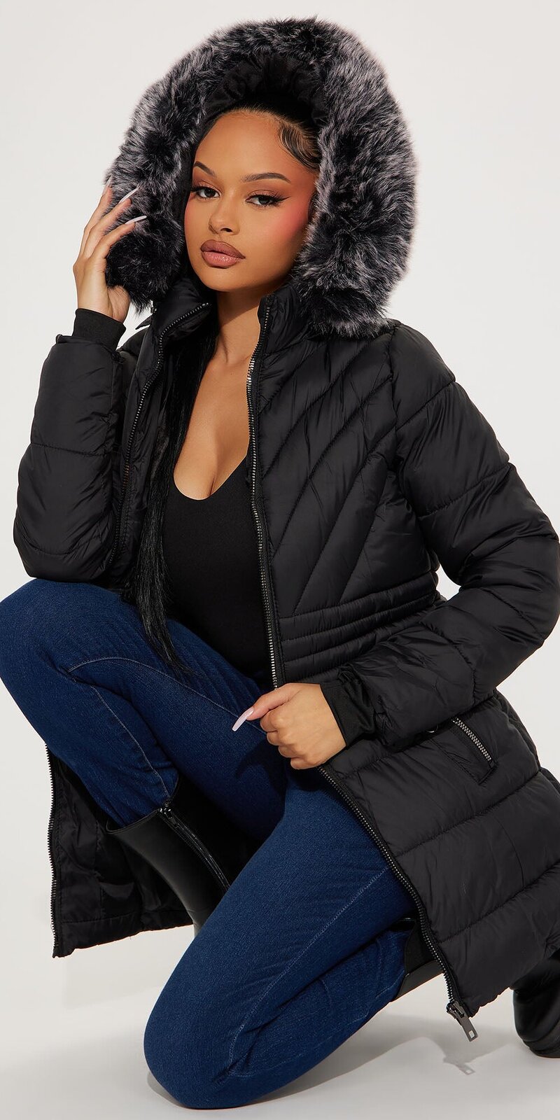 Hrejivá čierna dlhá prešívaná bunda s kapucňou zdobenou umelou kožušinkou. Má zapínanie na zips, praktické vrecká a jemné prešívanie po celej dĺžke. Ideálna na chladné zimné dni.