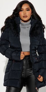Elegantná dámska bunda v čiernej farbe s luxusne pôsobiacou kapucňou z umelej kožušiny. Prešívaný strih s hrejivou výplňou z jemného syntetického vlákna poskytuje pohodlie a ochranu v chladnom počasí.