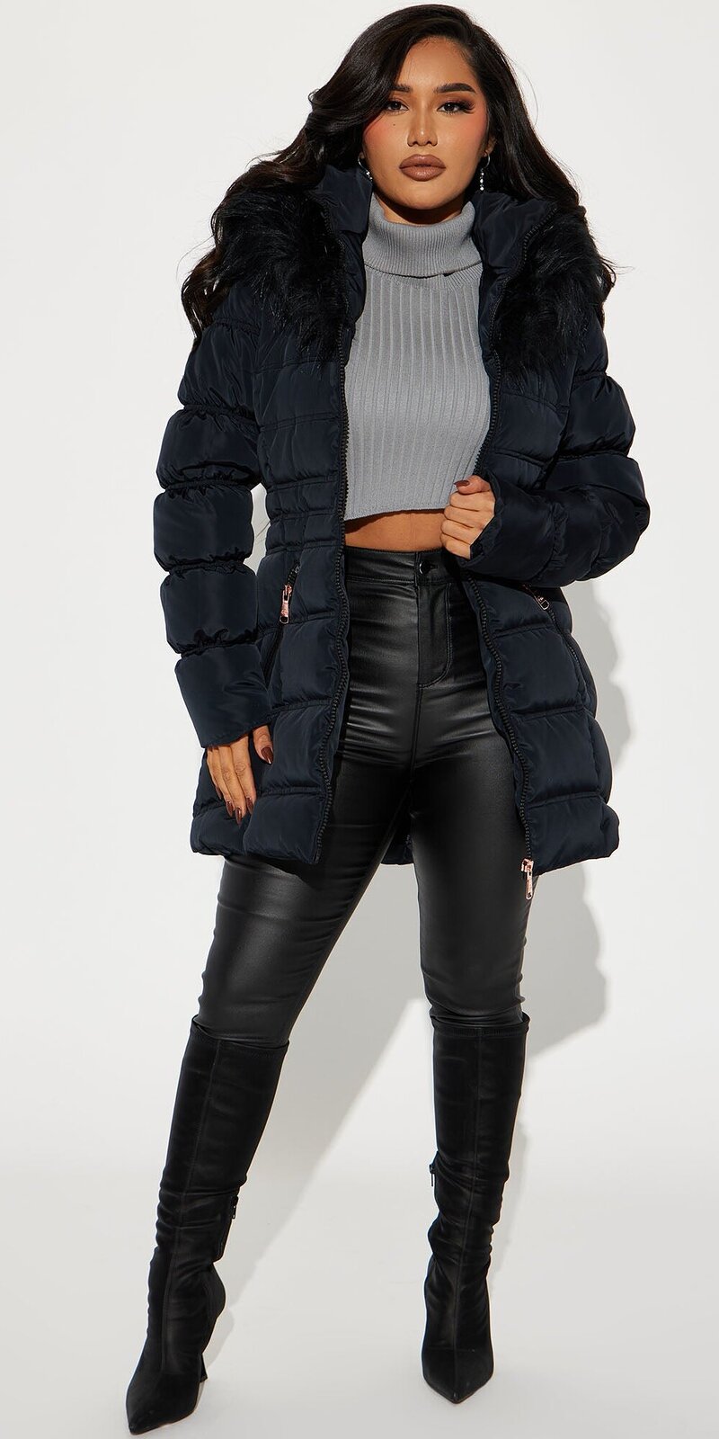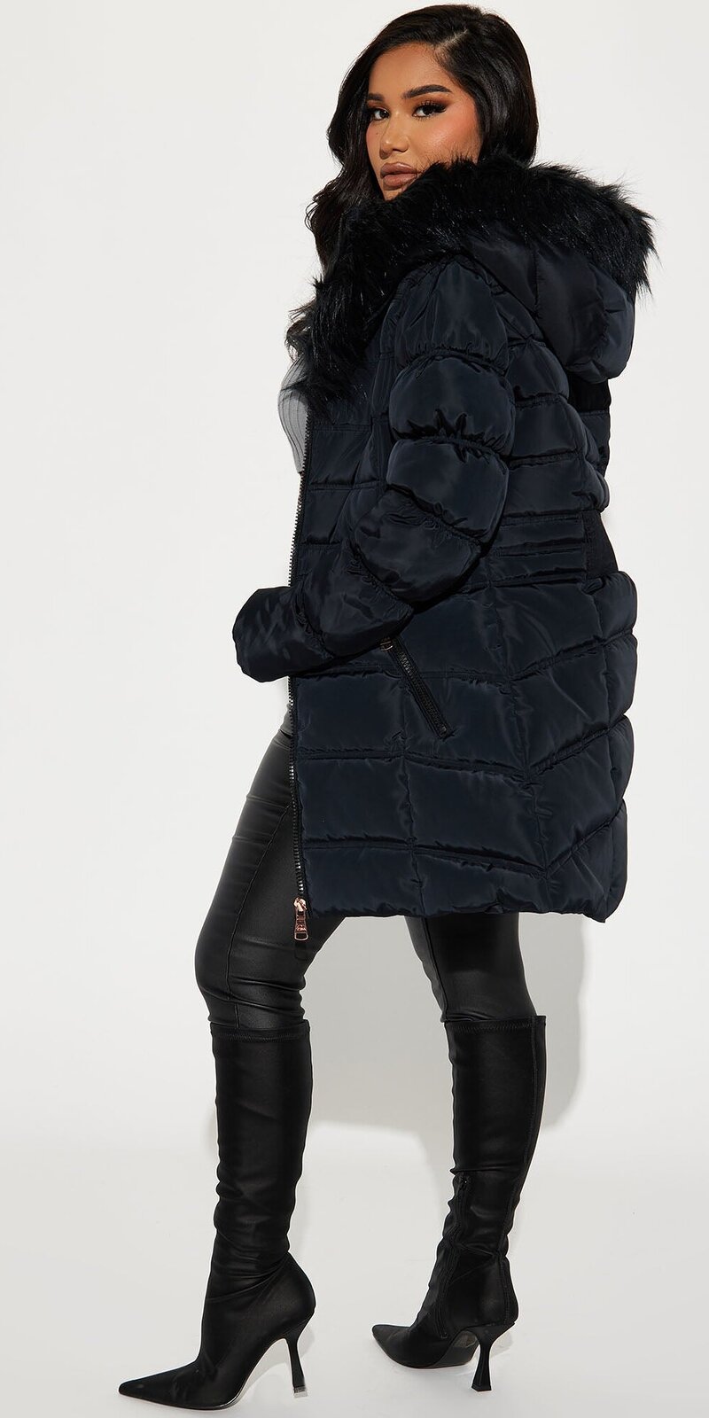 Kapucňa zdobená bohatou umelou kožušinou dodáva modelu luxusný nádych, zatiaľ čo lesklý zips a praktické vrecká zaručia funkčnosť a moderný štýl.