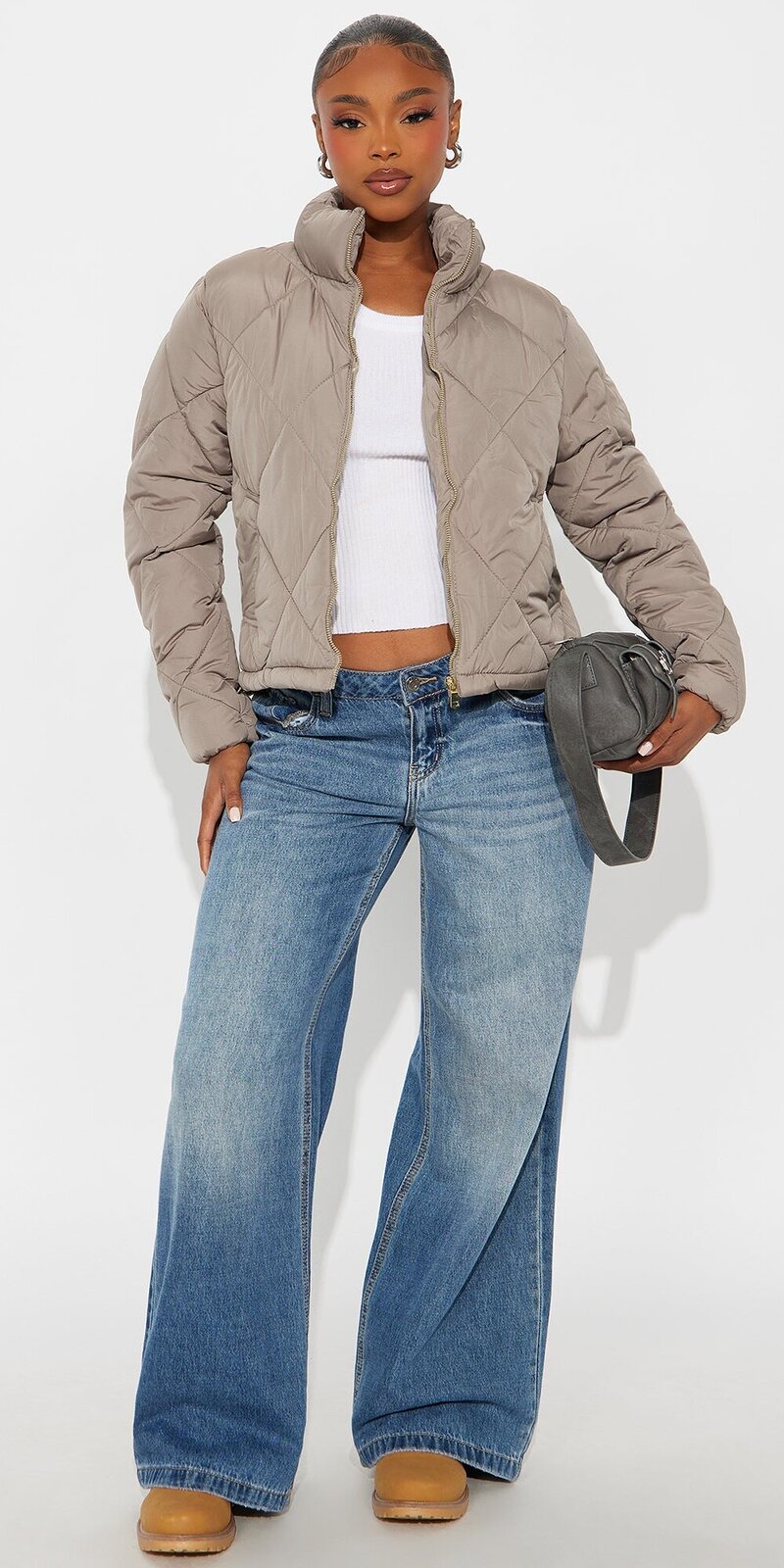 Khaki puffer bunda s dlhými rukávmi a golierom z prešívaného nylonu poskytuje teplo a moderný štýl pre chladnejšie dni.
