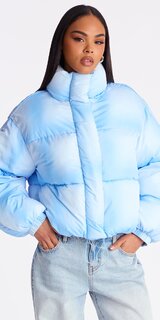 Krátka bunda v modrej farbe zaujme moderným ombré efektom a prešívaným puffer vzhľadom, ktorý pôsobí výrazne, štýlovo a zároveň luxusne. Hladký syntetický povrch je jemný na dotyk, ľahko lesklý a príjemný na nosenie, zatiaľ čo vysoký stojačik, dlhé rukávy a nastaviteľný spodný lem dodávajú modelu praktický aj módny charakter.