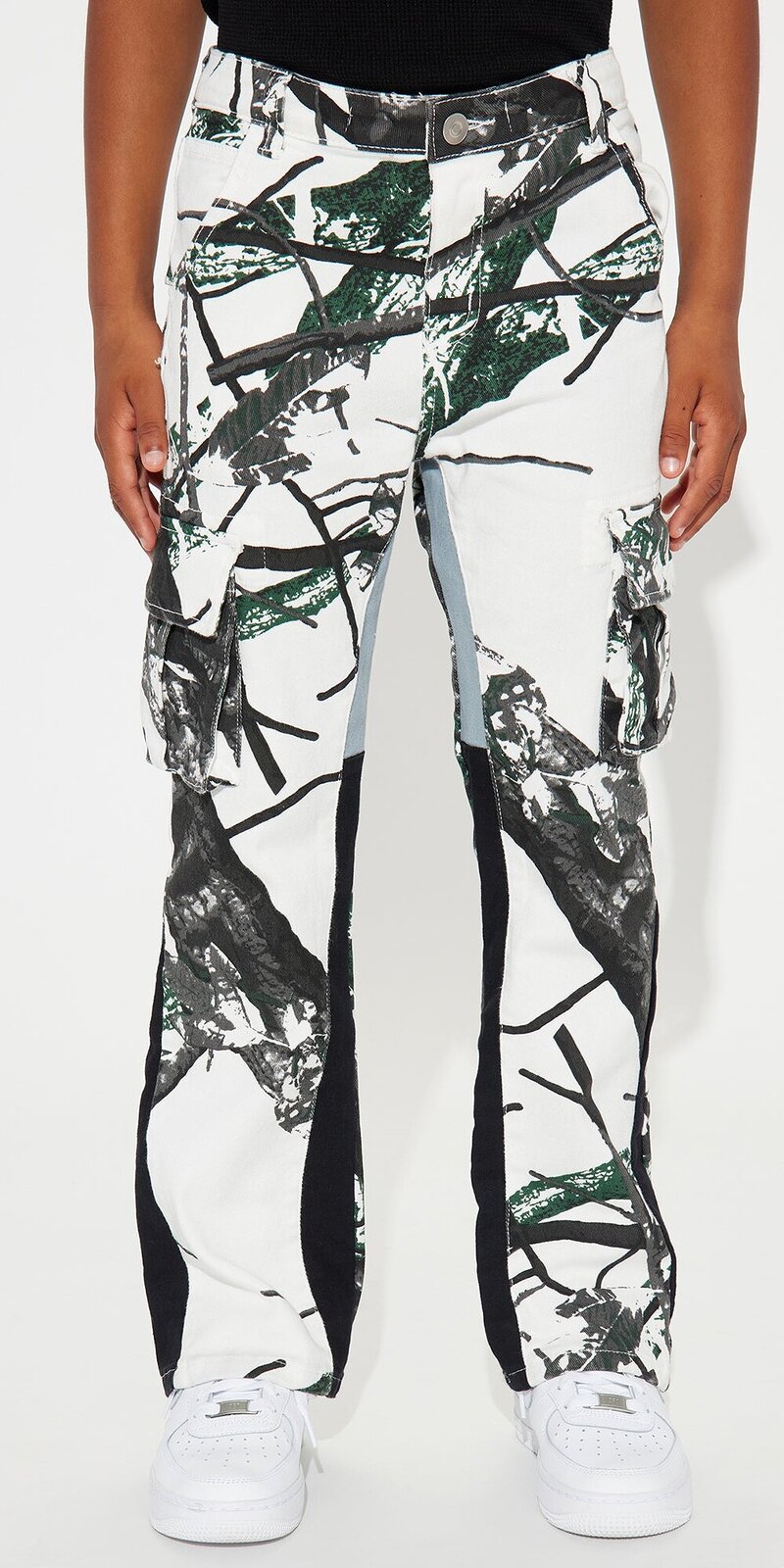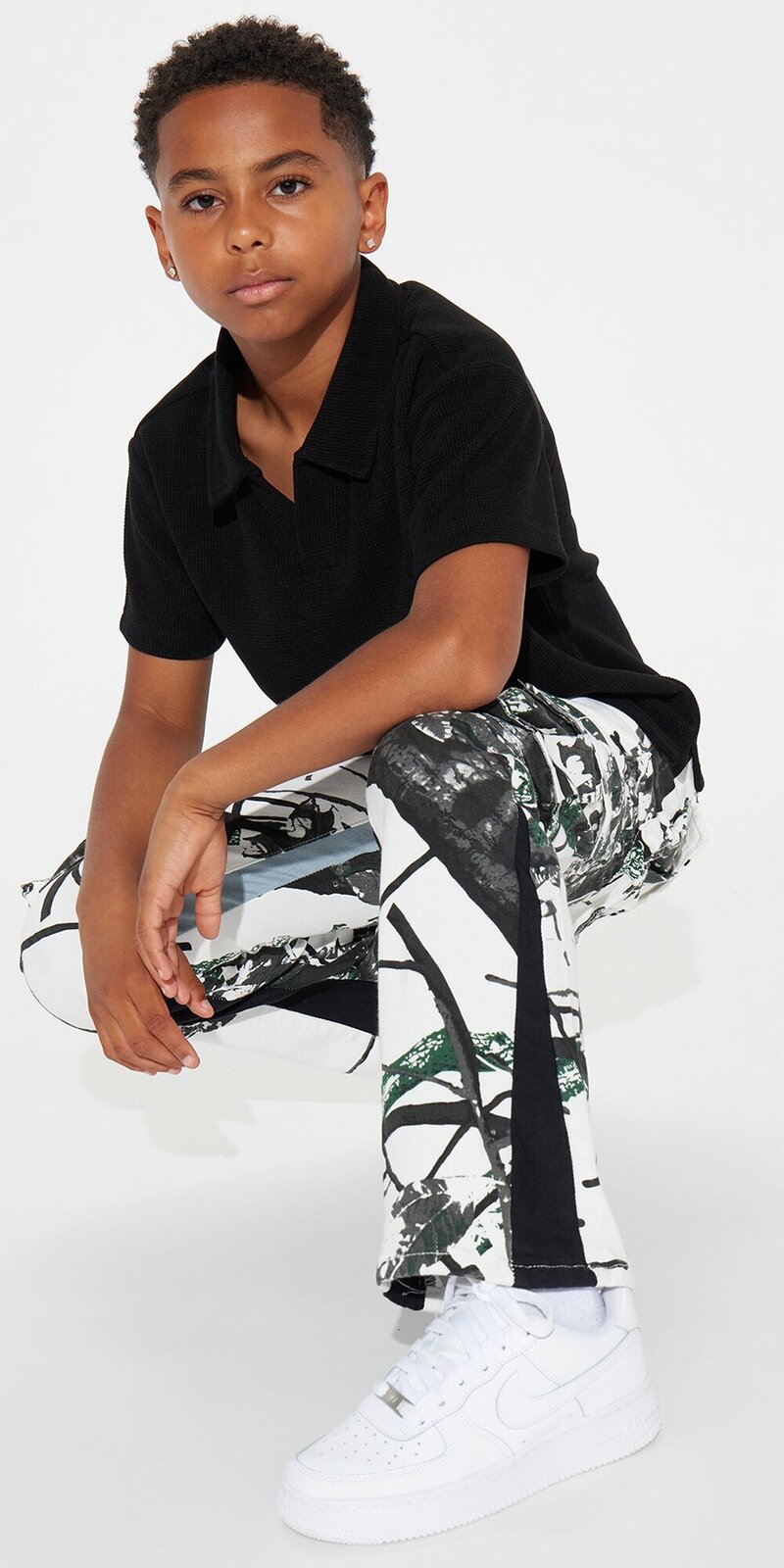 Štýlové detské cargo nohavice v maskáčovom vzore s rozšíreným strihom. Majú bočné vrecká, pútka na opasok a zapínanie na gombík. Vyrobené z bavlny s jemným podielom spandexu pre pohodlie pri pohybe.
