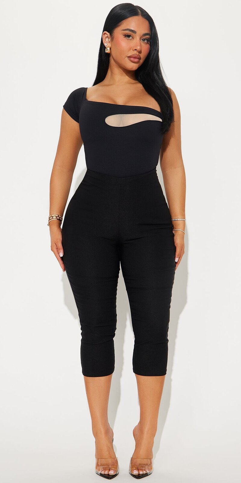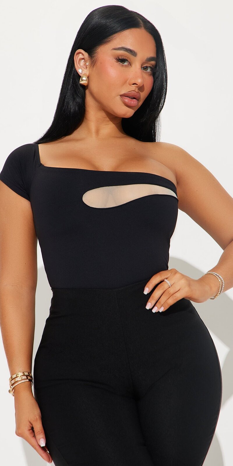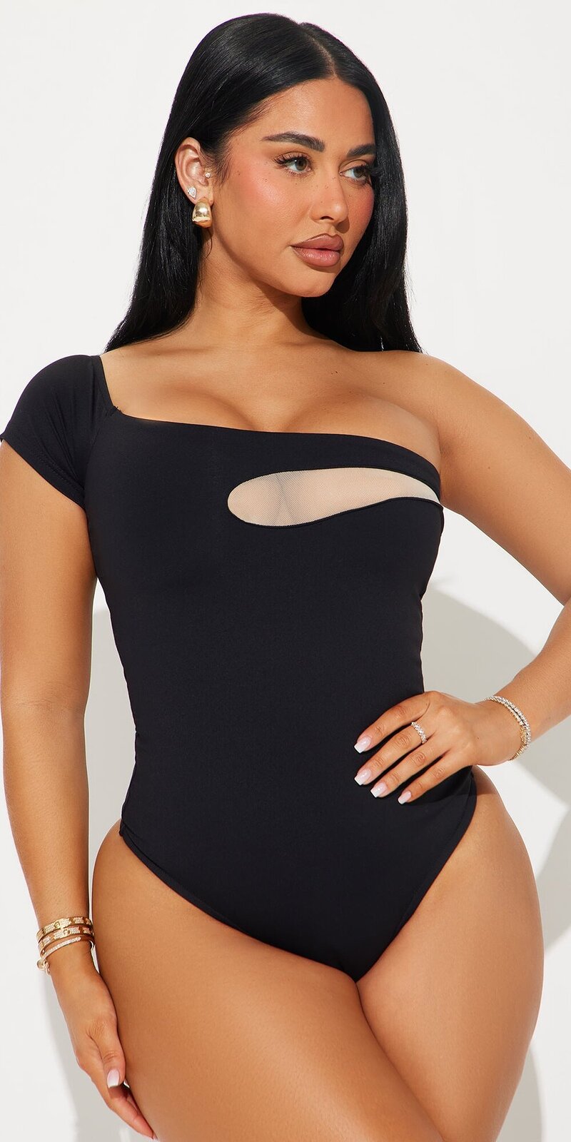 Toto čierne body s asymetrickým strihom na jedno rameno predstavuje spojenie moderného dizajnu a zvodnej elegancie. Priesvitný sieťovaný výrez decentne odhaľuje pokožku, čím vytvára rafinovaný a štýlový vzhľad.