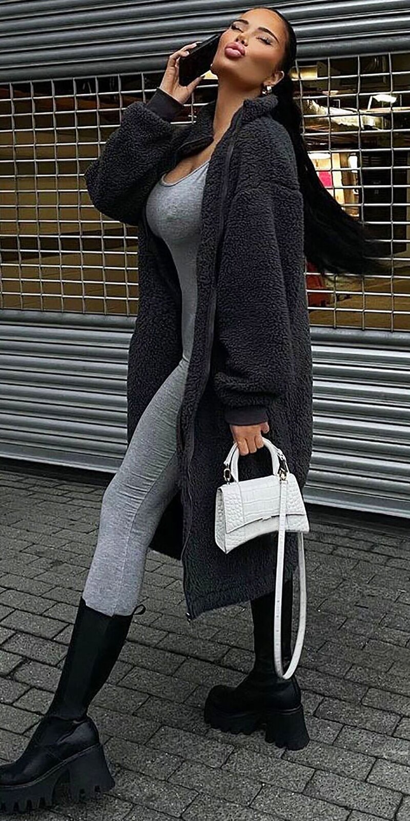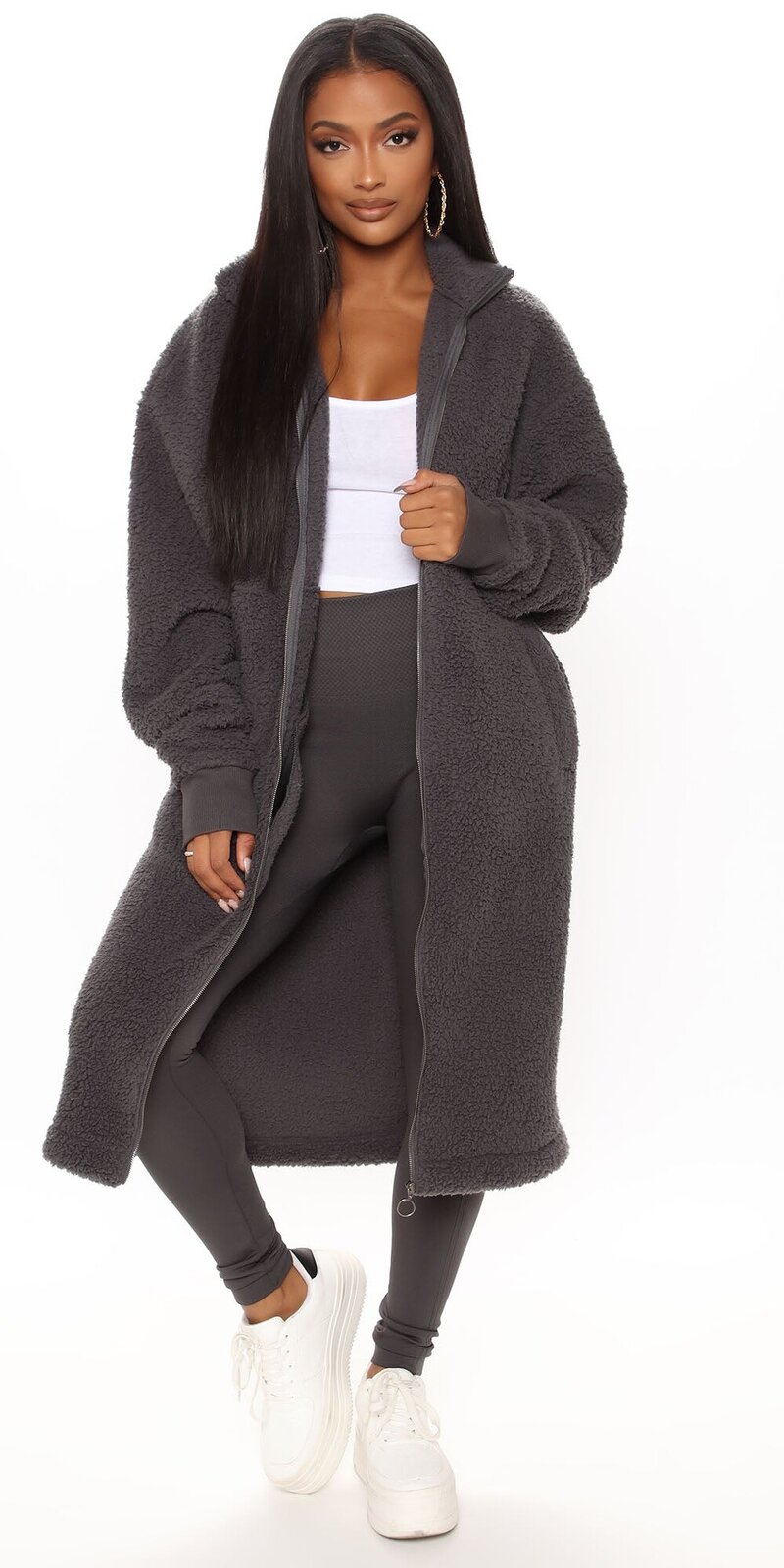 Mäkká a hrejivá sherpa bunda v tmavosivej farbe s dlhými rukávmi a zapínaním na zips. Pohodlný dlhší strih a praktické bočné vrecká ju robia ideálnou voľbou na chladné dni.