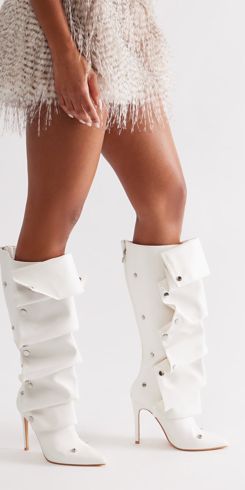 Elegantné dámske čižmy po kolená v bielej farbe s jemným riasením a luxusnými kovovými ozdobami. Vyrobené zo syntetickej kože s hladkým, hebkým povrchom a decentným leskom.