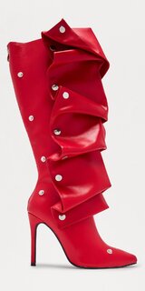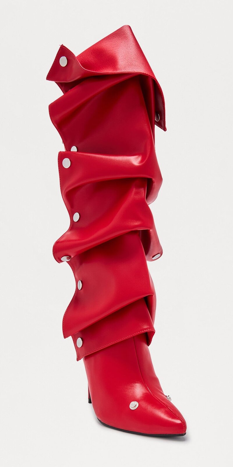 Tieto červené čižmy po kolená sú navrhnuté tak, aby okamžite pritiahli pozornosť. Ich riasený dizajn v kombinácii s kovovými ozdobami vytvára zmyselný a sebavedomý vzhľad.