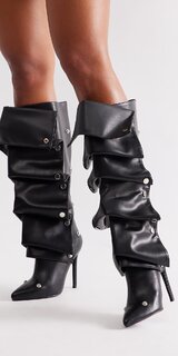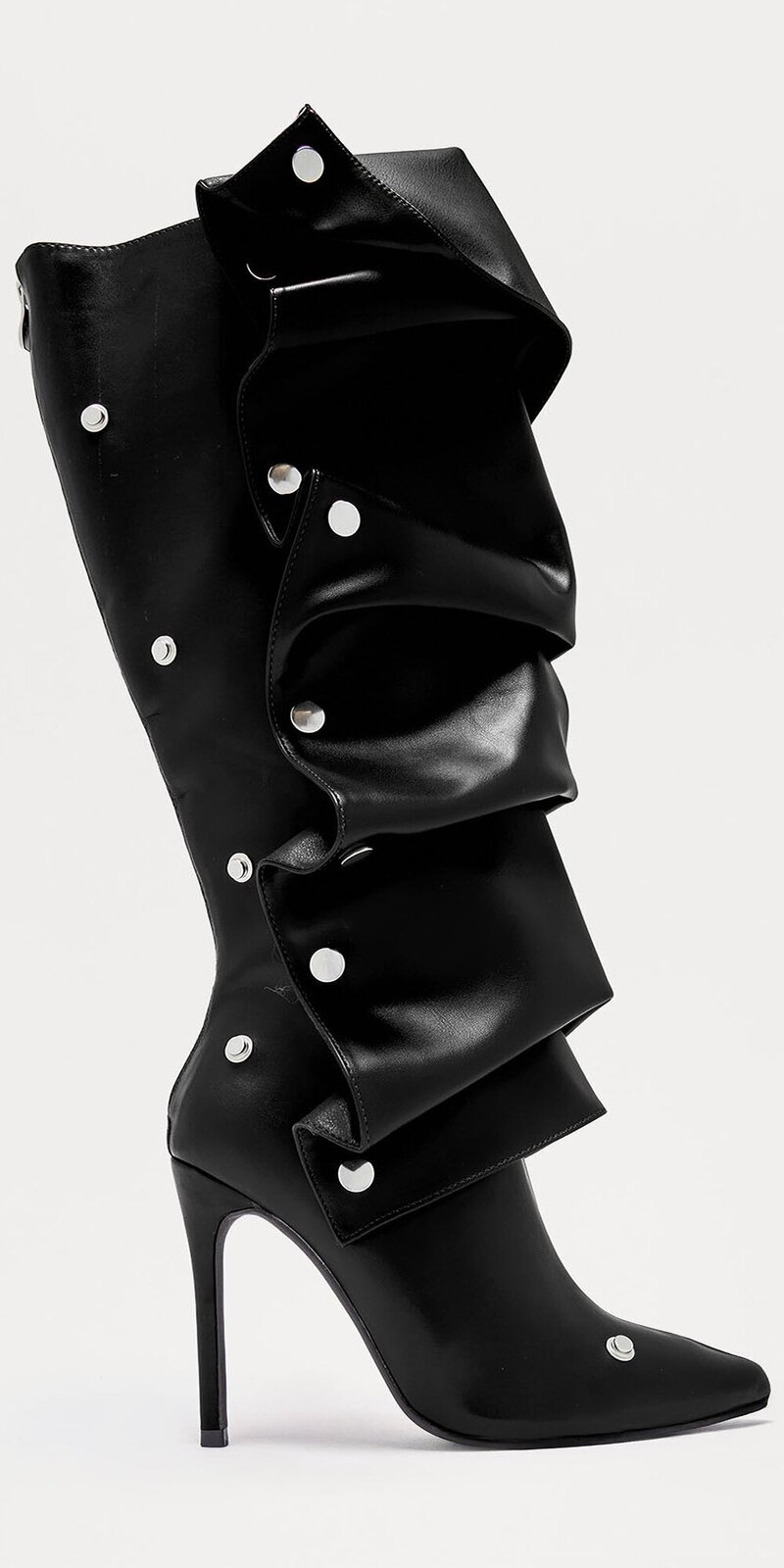 Tieto vysoké dámske čižmy v čiernej farbe vynikajú rafinovaným riasením, ktoré dodáva ich siluete ženskosť a šarm. Kovové aplikácie pôsobia elegantne a zaručujú výrazný vzhľad pri každom kroku.
