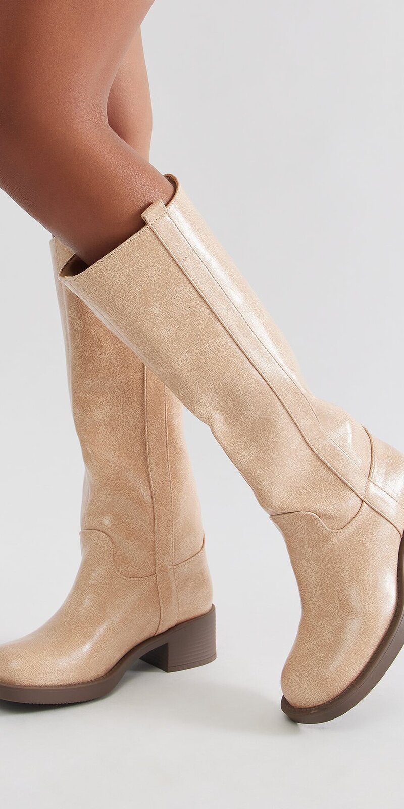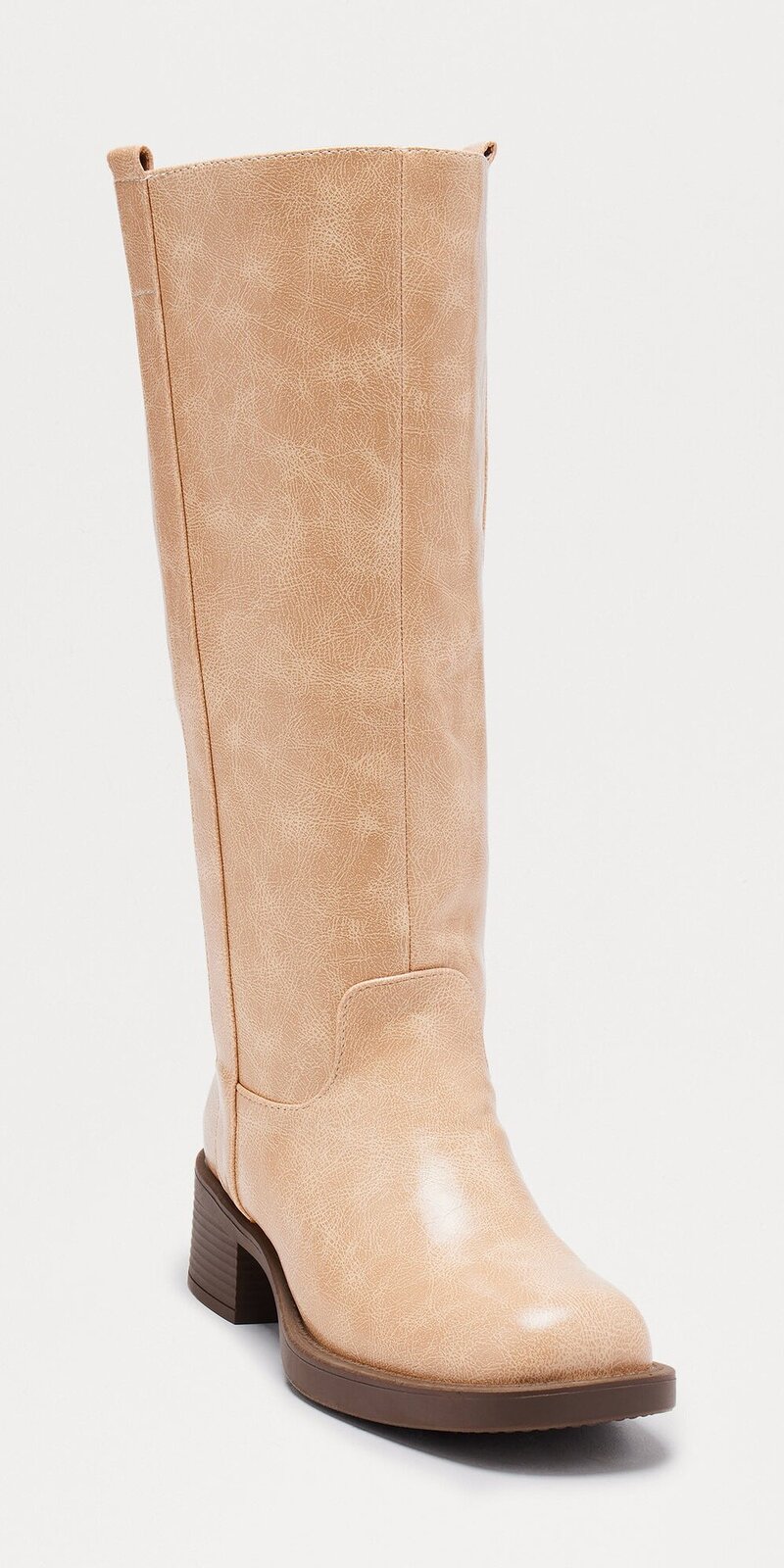 Elegantné čižmy po kolená v béžovej farbe zaujmú čistými líniami a pohodlným nízkym blokovým podpätkom. Hladký syntetický povrch je jemný na dotyk, pôsobí luxusne a dodáva obuvi moderný mestský charakter.