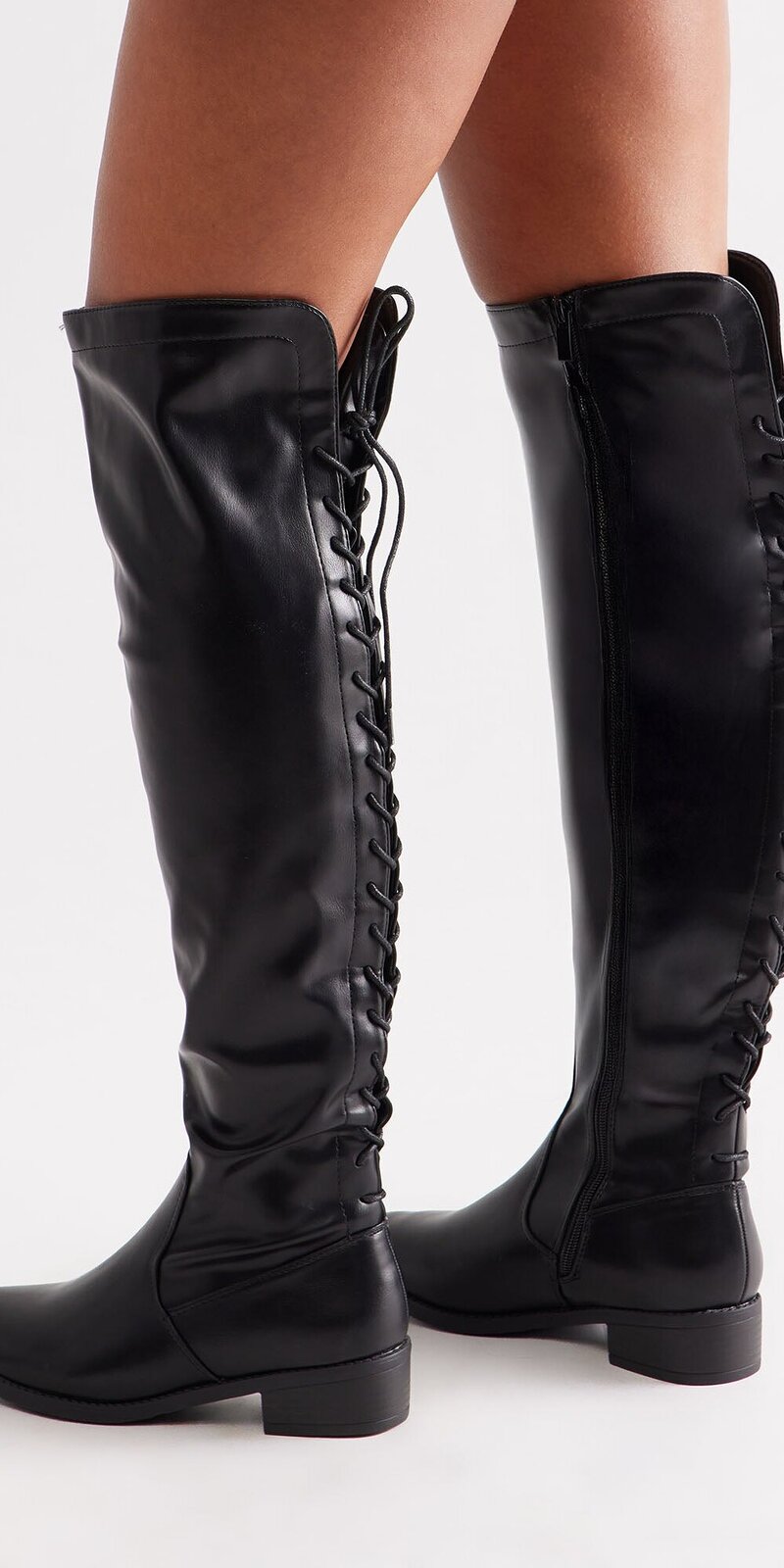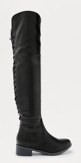 Vysoké čižmy v čiernej farbe pôsobia odvážne a štýlovo vďaka šnurovaniu po celej dĺžke, zaoblenej špičke a elegantnej siluete nad kolená.