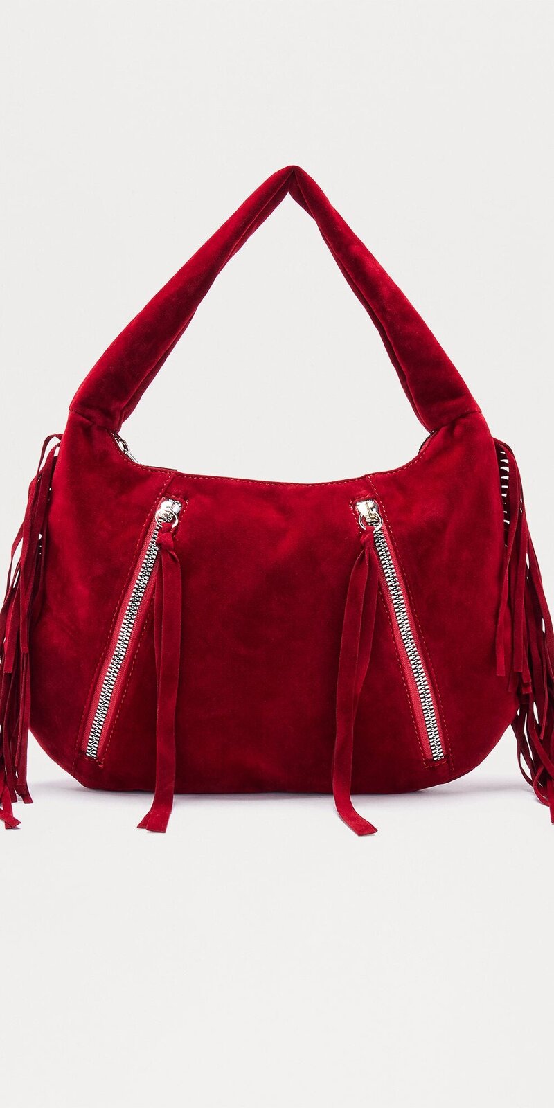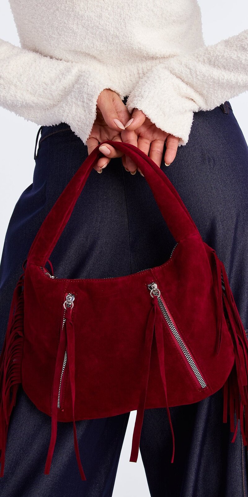 Štýlová bordová kabelka z jemného umelého semišu so strapcovým zdobením. Praktická veľkosť a zapínanie na zips ju robia ideálnou na každodenné nosenie. Kovové detaily a bočné zipsy dodávajú moderný vzhľad.