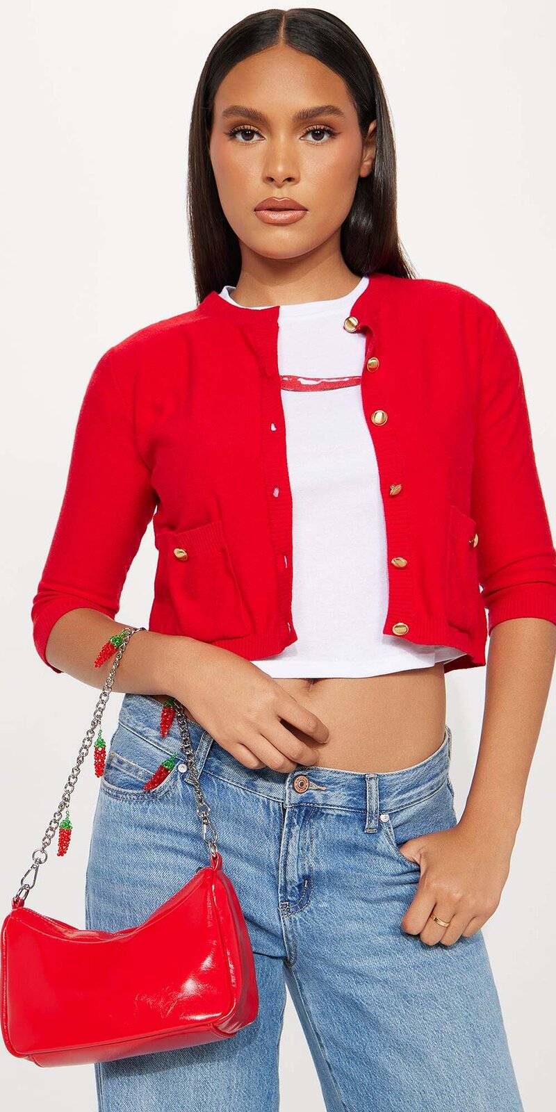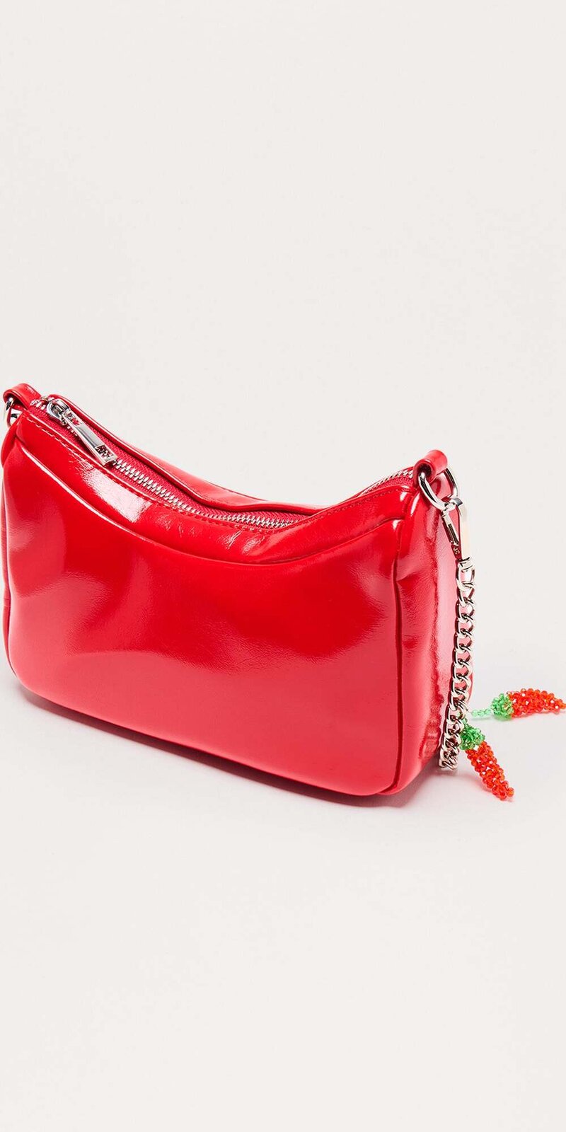 Výrazná červená lakovaná ramenná kabelka s lesklým povrchom, kovovou retiazkou a hravým príveskom v tvare chilli papričky. Praktické zapínanie na zips a originálne detaily dodávajú kabelke šarm.