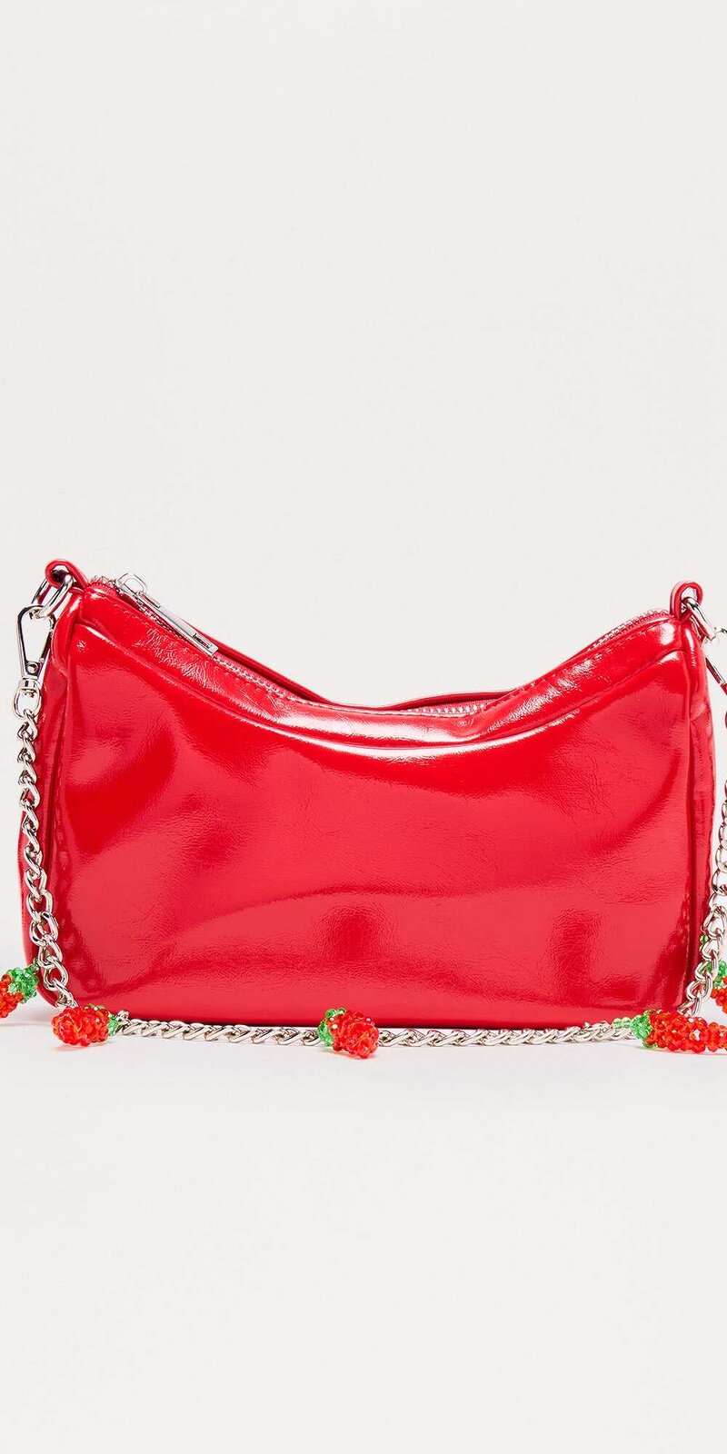 Táto červená lakovaná ramenná kabelka je doplnkom, ktorý okamžite pritiahne pozornosť.