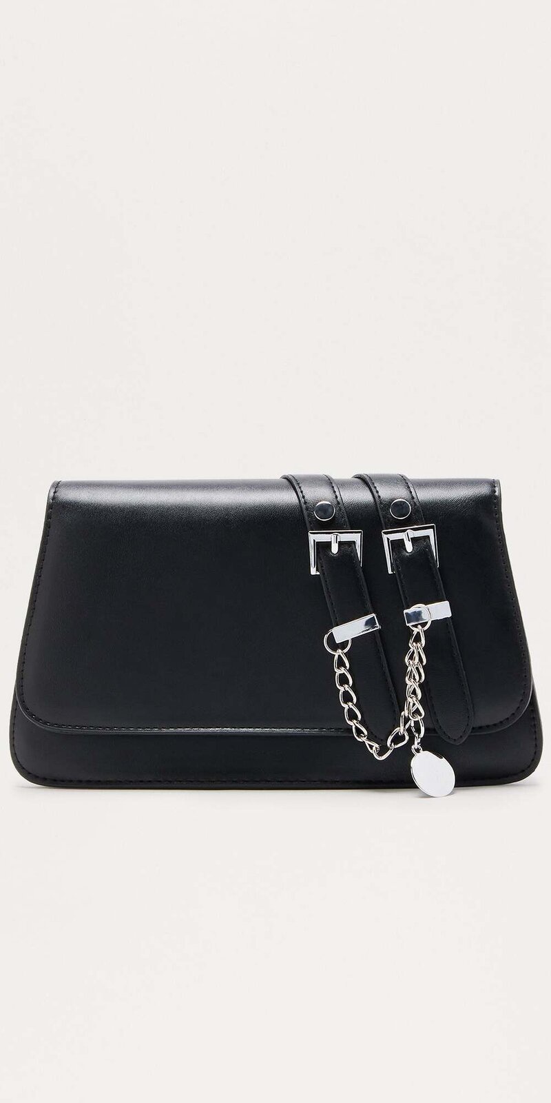 Trendy čierna ramenná kabelka z umelej kože s preklopným zapínaním, kovovými detailmi a výraznou prackou. Odnímateľný a nastaviteľný popruh poskytuje variabilitu nosenia.