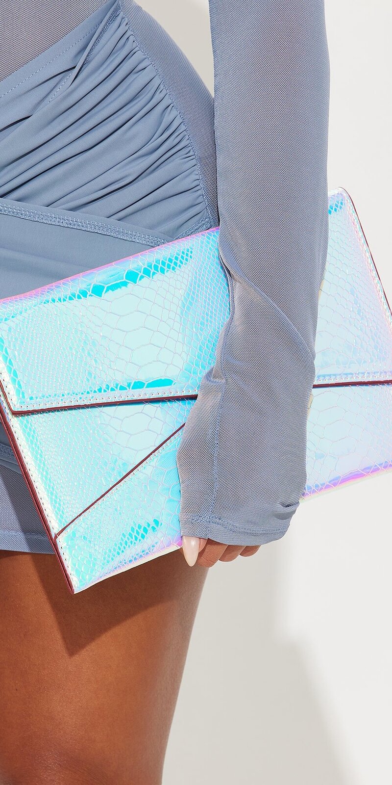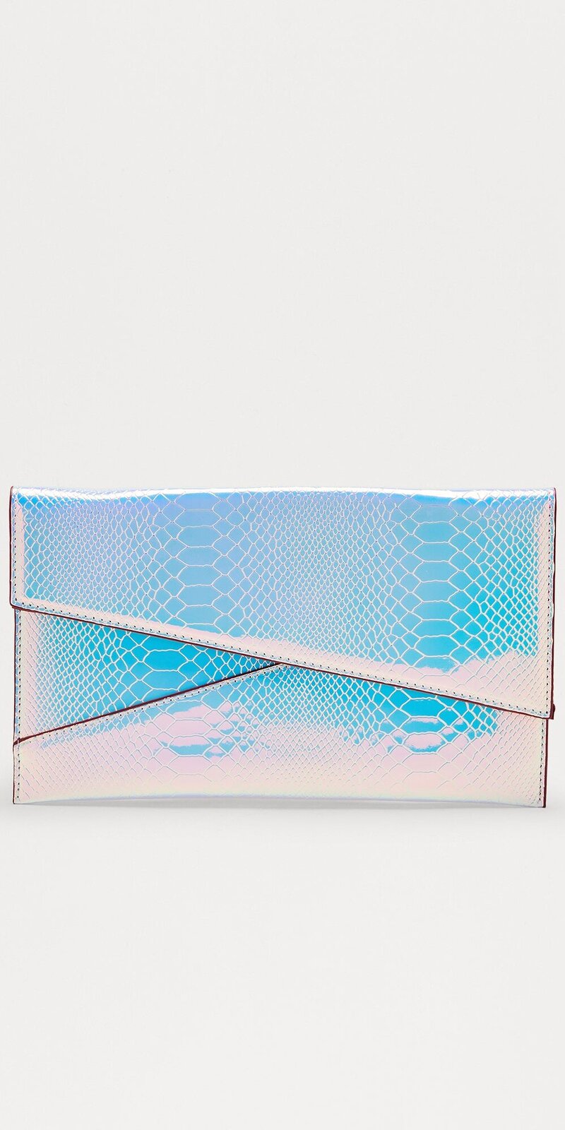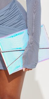 Táto listová kabelka zaujme jedinečným duhovým efektom, ktorý pri dopade svetla mení farebné odtiene a vytvára žiarivý, luxusný vzhľad. Je ideálnym doplnkom na večerné príležitosti, kde chcete zaujať moderným a prepracovaným detailom.