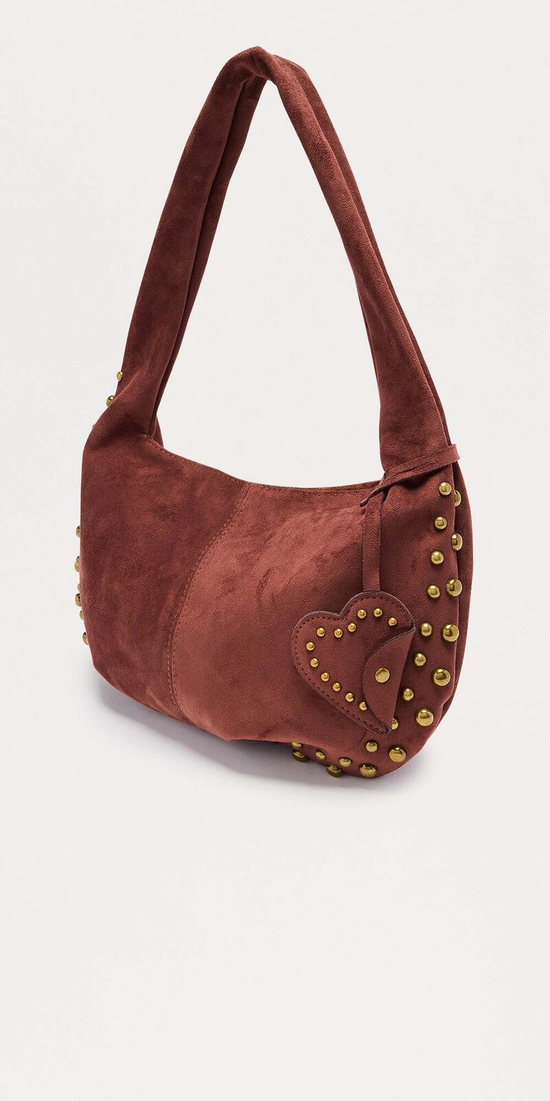 Originálna hnedá ramenná kabelka s efektom brúsenej kože, ozdobená srdcovým motívom a kovovými cvokmi. Praktický formát spája eleganciu s trendovým štýlom.
