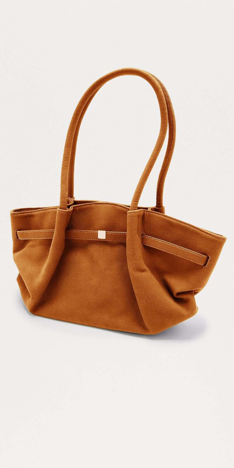 Štýlová oversized ramenná kabelka v hnedom odtieni z jemného semišu s praktickým zapínaním na cvok. Ideálny doplnok pre ženy, ktoré preferujú kombináciu priestoru a elegancie.