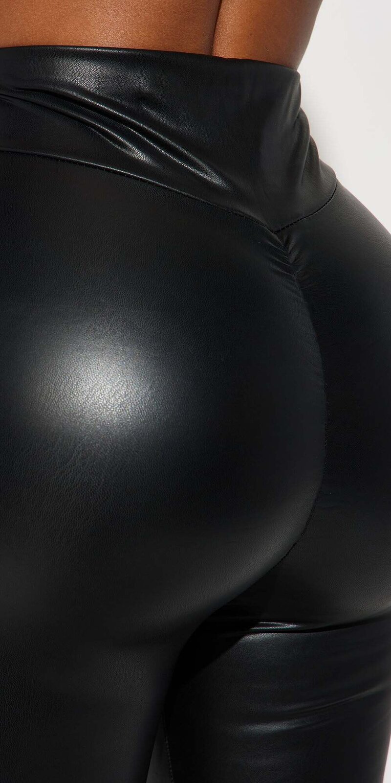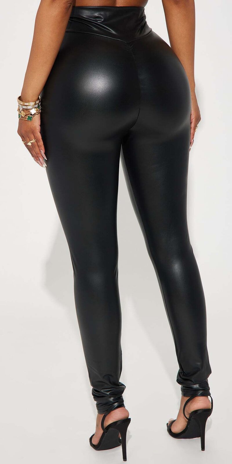Štýlové čierne legíny s efektom umelej kože, ktoré zaujmú lesklým povrchom a vysokým pásom. Elastický materiál sa dokonale prispôsobí postave a zdôrazní ženské krivky, zatiaľ čo riasenie na zadnej časti dodáva atraktívny vzhľad.