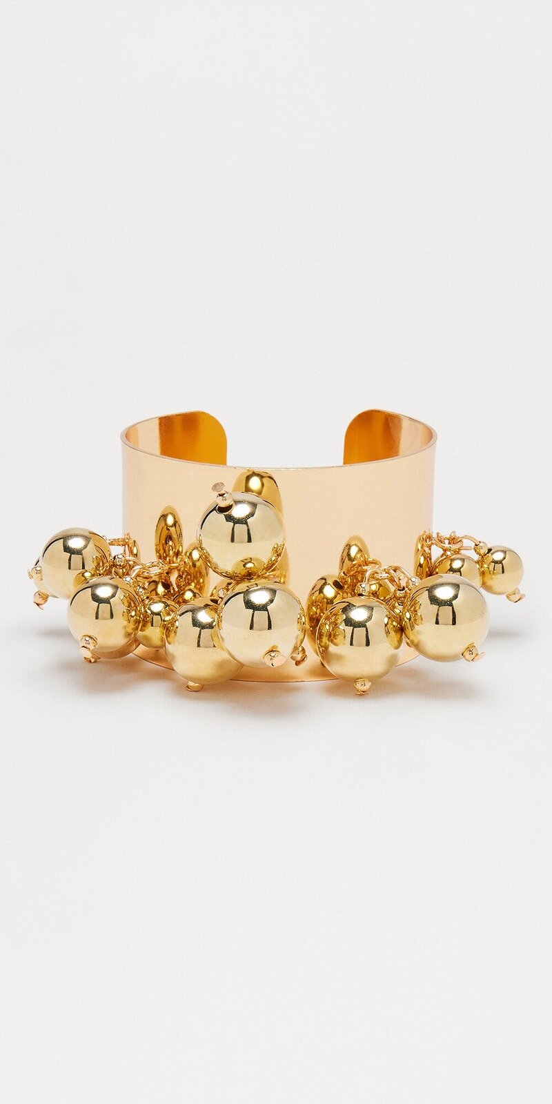 Elegantný otvorený náramok v zlatej farbe zaujme minimalistickým dizajnom a výraznými guľôčkovými zakončeniami. Hladký kovový povrch sa jemne leskne a pôsobí luxusne pri každom pohybe ruky.