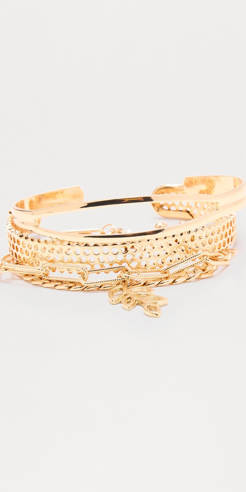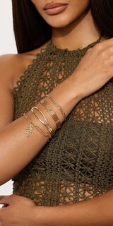 Luxusná dvojdielna súprava náramkov v zlatom prevedení zdobená jemnými trblietavými kamienkami dodáva zápästiu žiarivý a ženský nádych. Subtílne retiazkové línie pôsobia ušľachtilo a náramky môžete nosiť spolu alebo samostatne podľa štýlu outfitu. Lesklý povrch zvyšuje ich nadčasový vzhľad.
