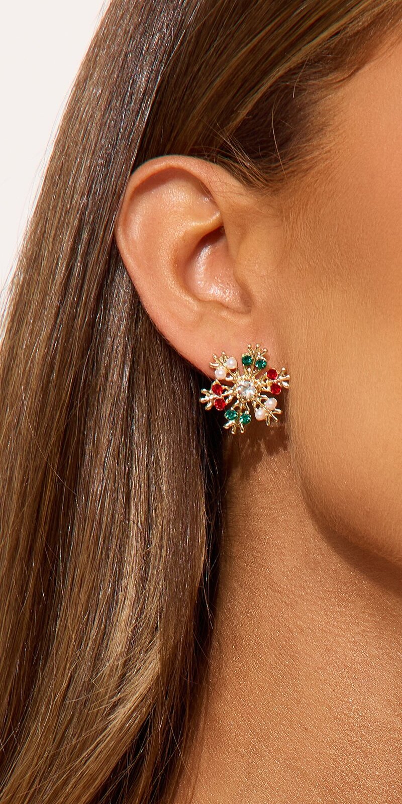 Decentné zlaté náušnice v tvare snehovej vločky pôsobia žiarivo a elegantne. Trblietavé kamienky zvýrazňujú ich jemný dizajn a dodávajú doplnku sviatočný, no stále nadčasový charakter. Ľahká kovová konštrukcia a puzetové zapínanie zaisťujú pohodlné každodenné nosenie.