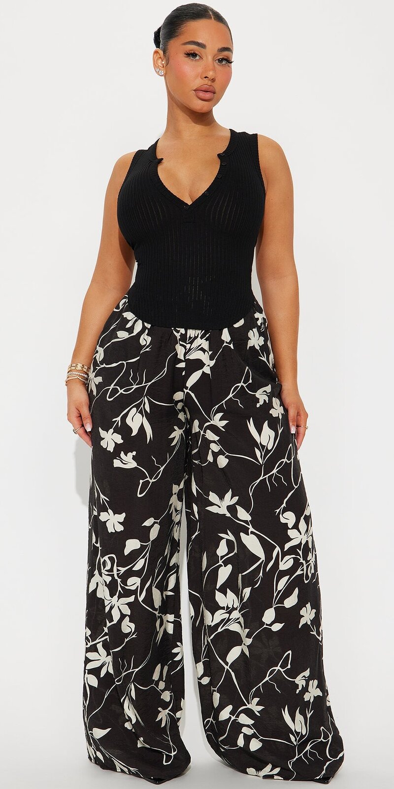 Čierno-biele nohavice s tropickým vzorom sú dokonalou voľbou pre ženy, ktoré hľadajú štýlový a vzdušný outfit. Ich vysoký pás opticky predlžuje postavu, zatiaľ čo široké nohavice vytvárajú elegantnú, plynulú siluetu.