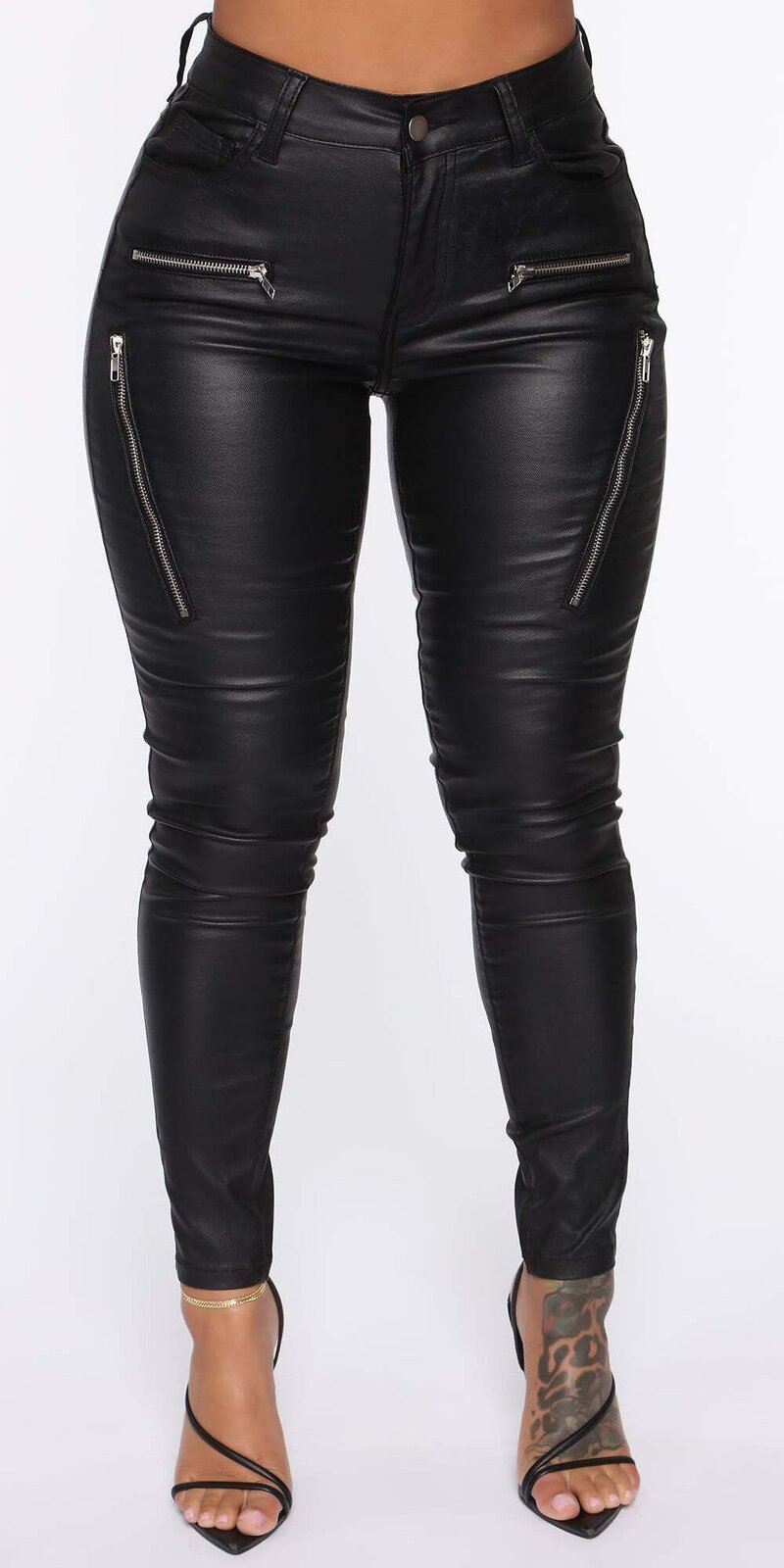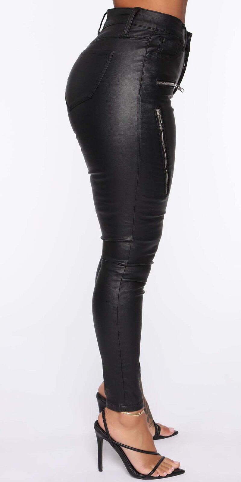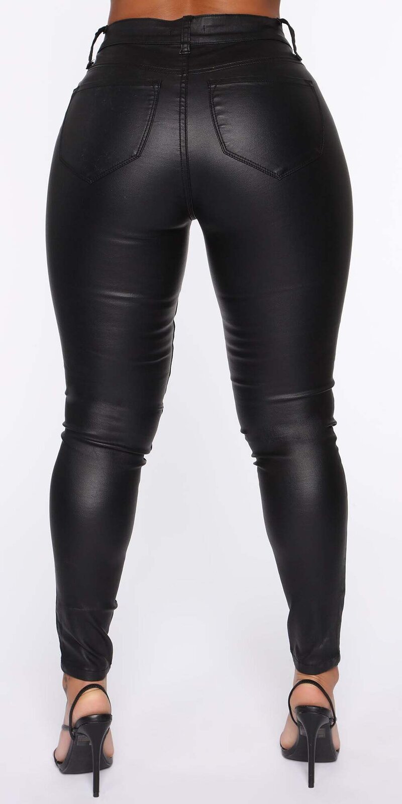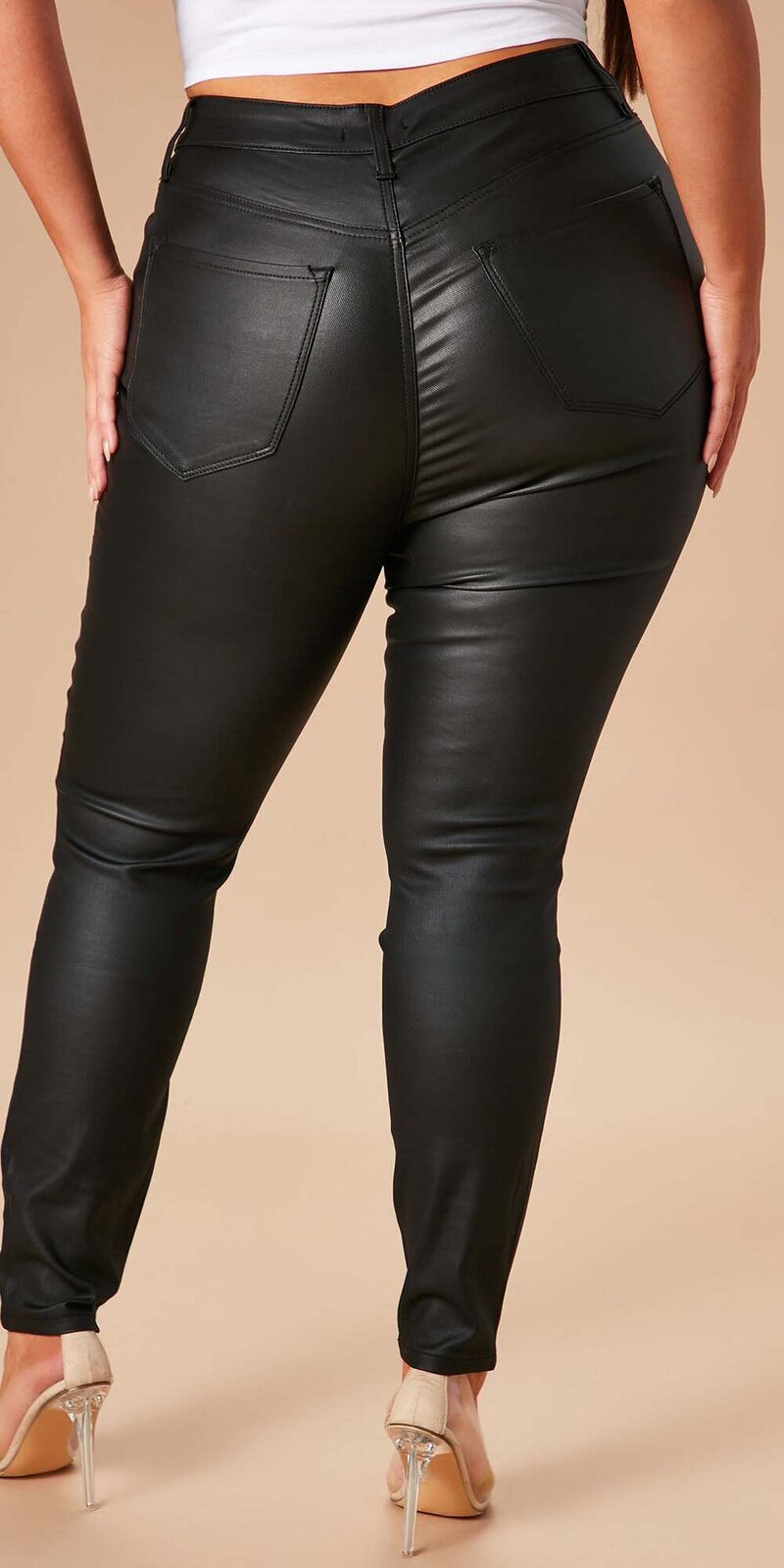 Tieto čierne skinny nohavice predstavujú dokonalé spojenie moderného dizajnu a luxusného vzhľadu. Povrchová úprava z koženky dodáva nohaviciam sofistikovaný charakter a jemný lesk, ktorý pôsobí prémiovo.