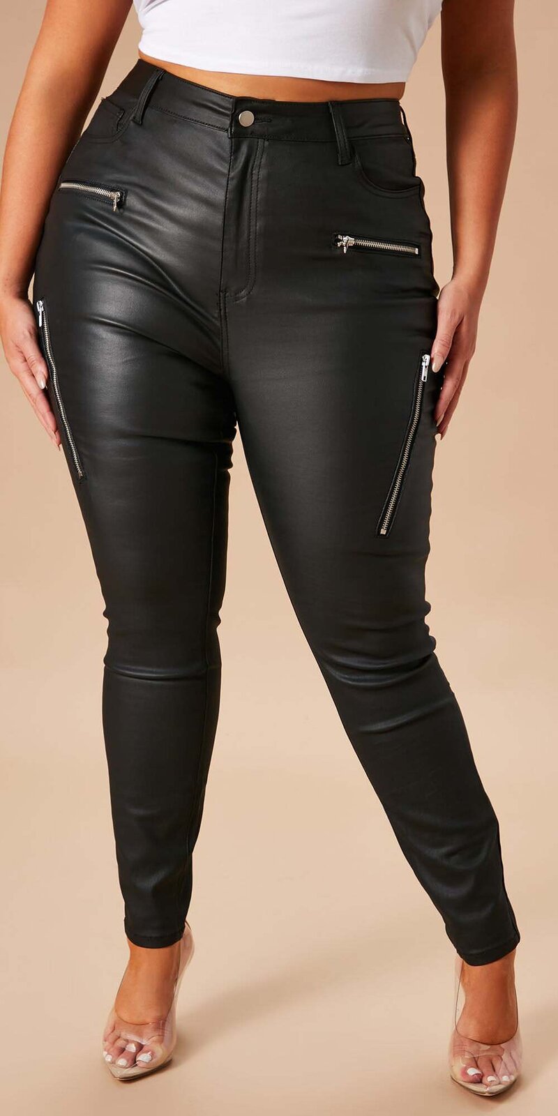 Moderné čierne skinny nohavice s povrchovou úpravou z jemnej koženky. Štýl dotvárajú dekoratívne zipsové detaily a praktické predné aj zadné vrecká.