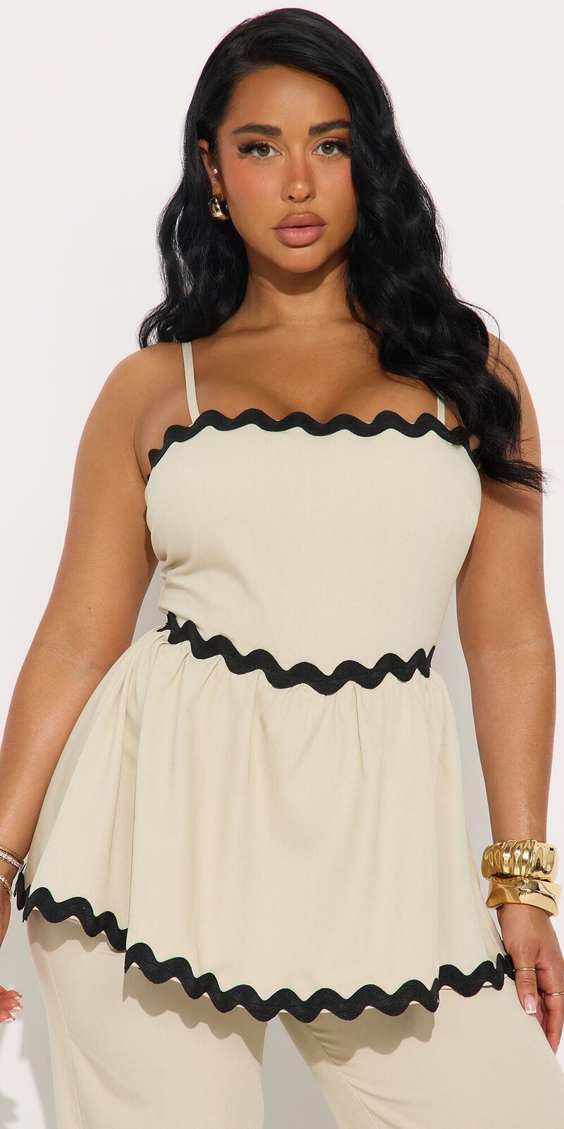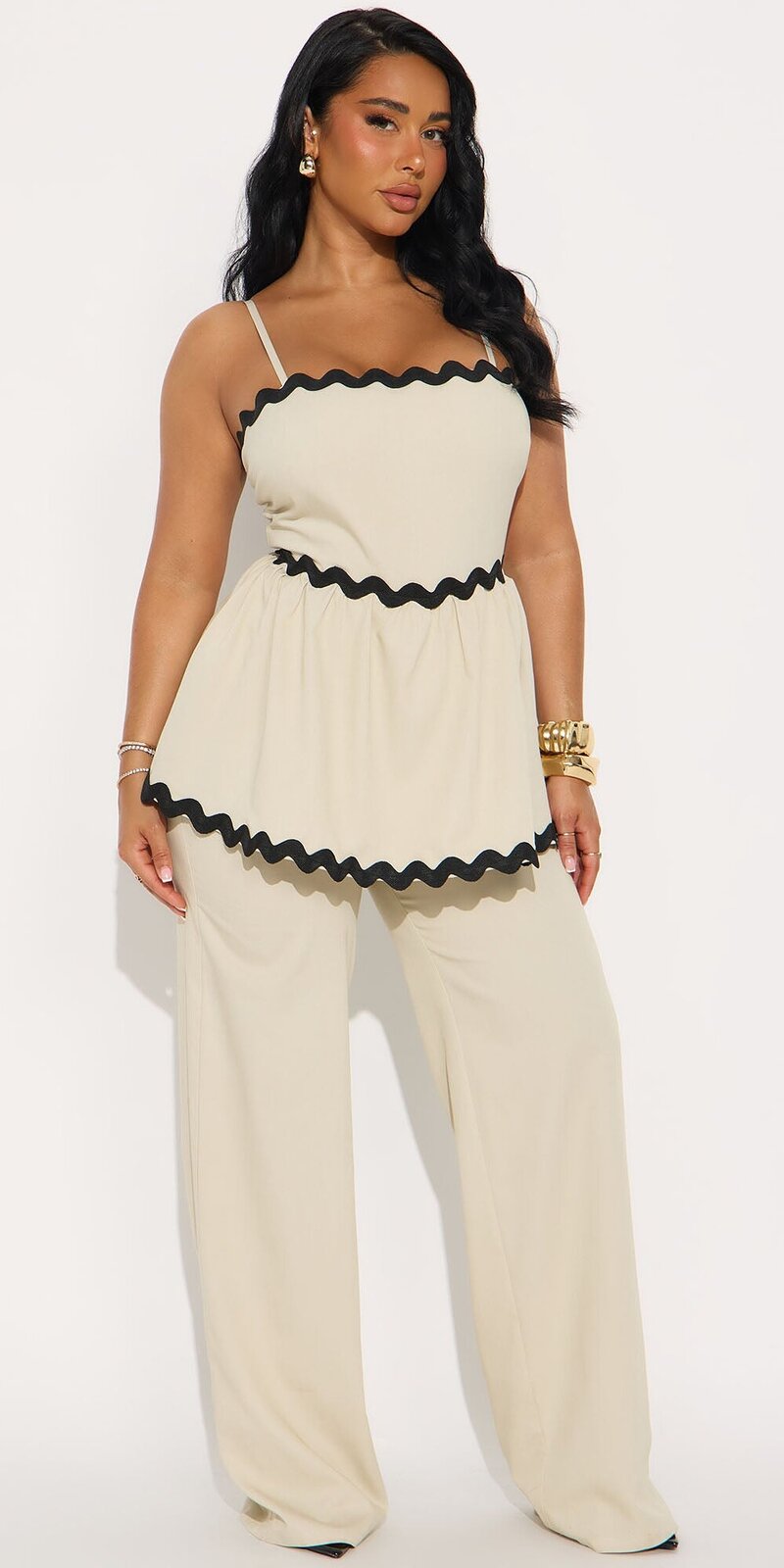 Tento béžový vzorovaný overal so širokými nohavicami je stelesnením nenútenej elegancie. Lehký, kvalitný materiál s jemnou štruktúrou krásne splýva a vytvára vzdušnú, no zároveň pôsobivú siluetu.
