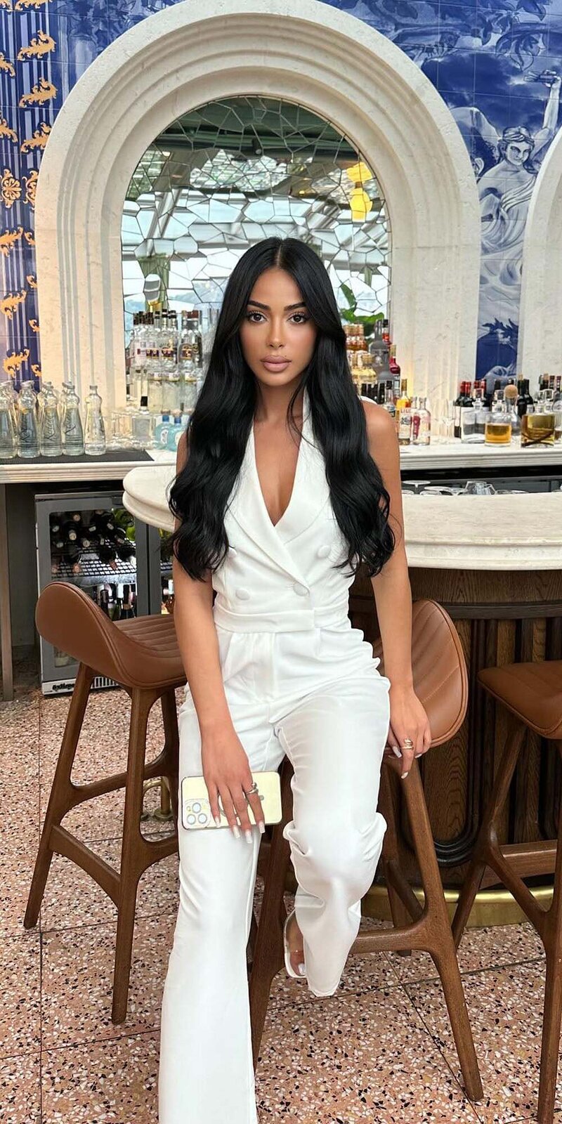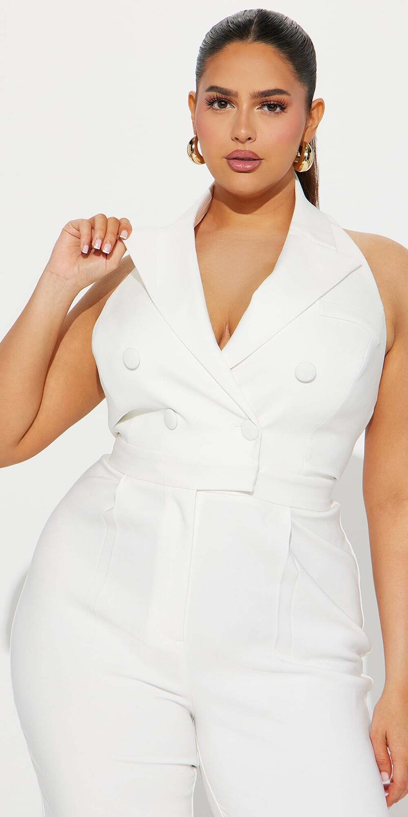 Štýlový overal v bielej farbe s halter golierom a výrazným výstrihom do V pôsobí elegantne a sofistikovane. Pružná tkanina s jemným leskom sa krásne prispôsobí postave a zvýrazní jej ladné línie.