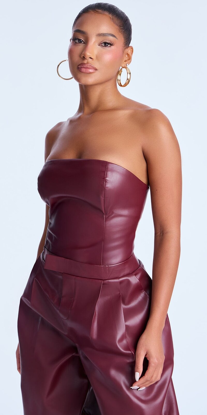 Luxusný dvojdielny dámsky overal Alessandra z bordovej syntetickej kože pozostáva z elegantného blejzra a širokého overalu. Hladký, lesklý povrch vytvára sofistikovaný dojem a dokonale zvýrazní ženské krivky.