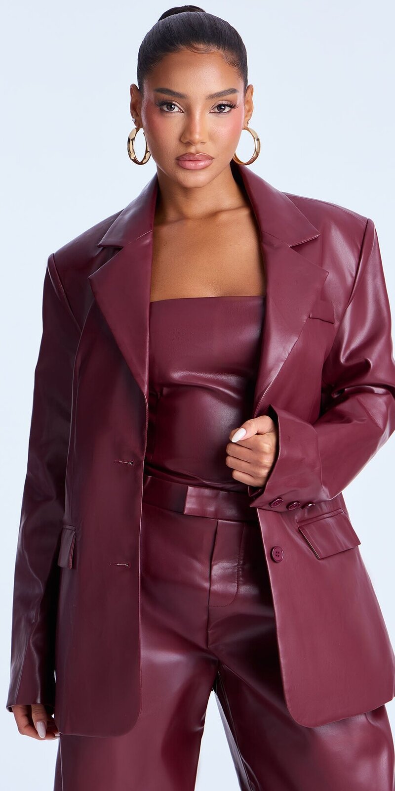Overal Alessandra v bordovej farbe predstavuje výrazný módny kúsok, ktorý spája odvážnosť koženkového vzhľadu s eleganciou dámskeho blejzra. Hladký povrch s jemným leskom pôsobí noblesne a moderne zároveň.