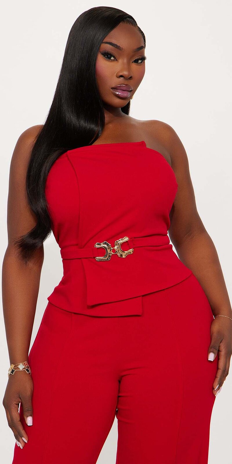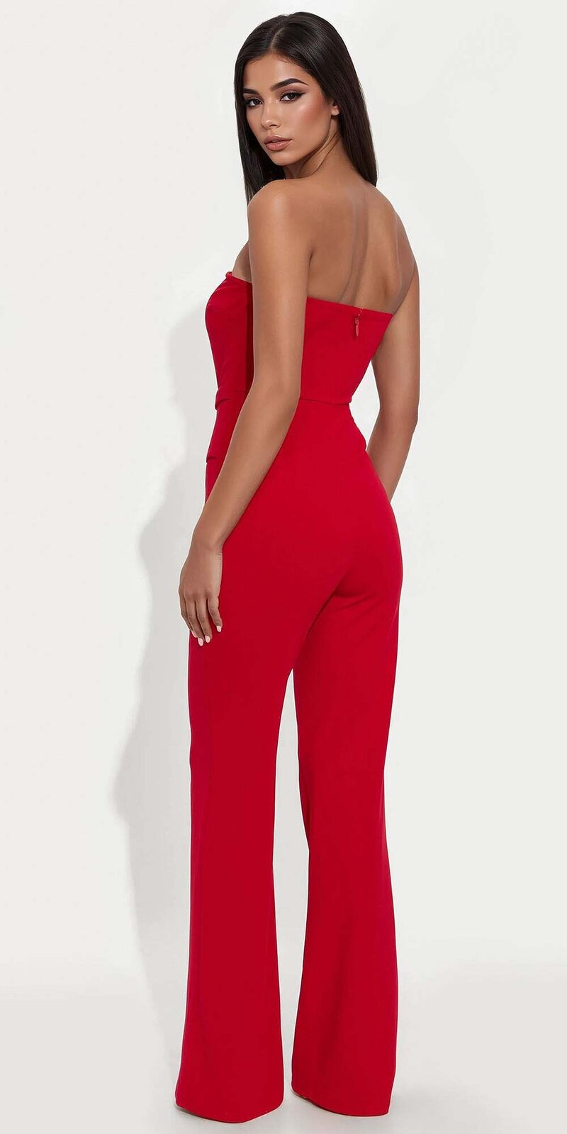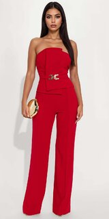 Pútavý červený overal s elegantným kovovým detailom a širokými nohavicami. Pružný materiál dokonale zvýrazní ženskú postavu a poskytne komfort pri nosení.