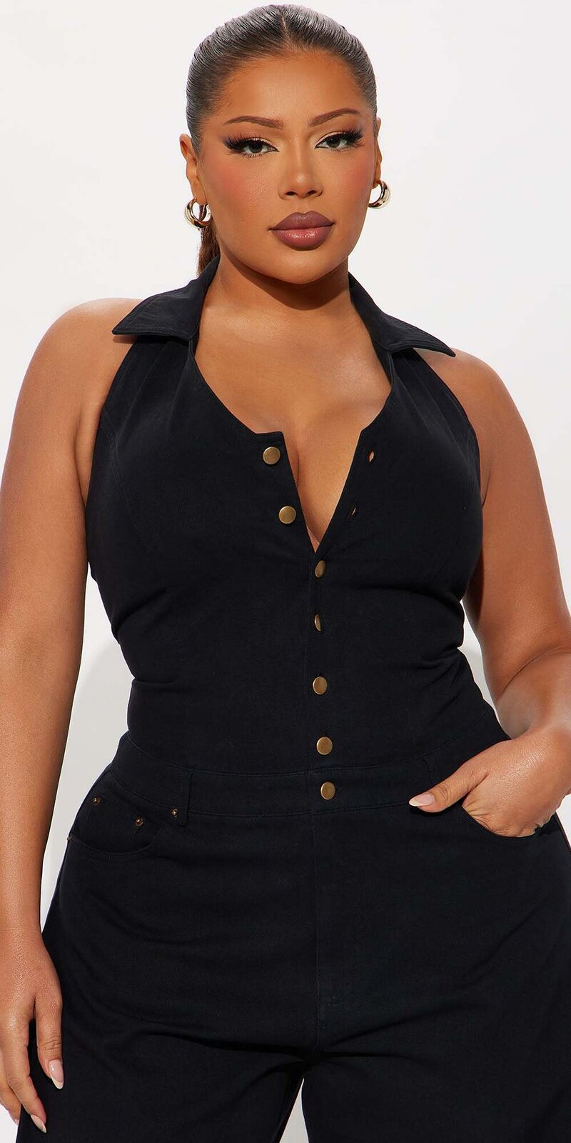 Nadčasový overal v čiernej farbe so zapínaním na gombíky a praktickými vreckami pôsobí ležérne a zároveň štýlovo. Široké barrel nohavice dodávajú originálnu siluetu, ktorá sa odlišuje od klasických strihov. Bavlnená tkanina je pevná, priedušná a príjemná na nosenie.