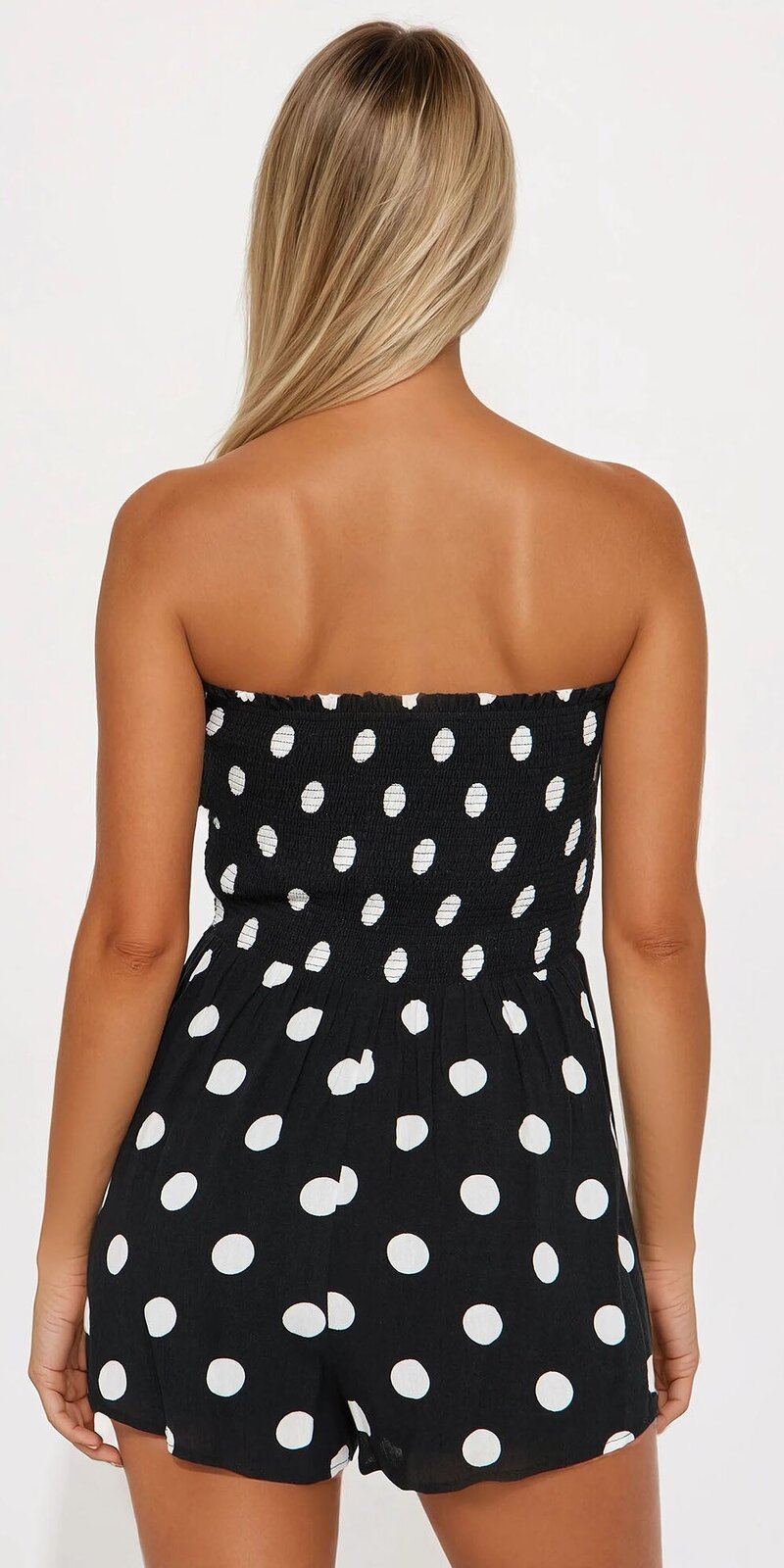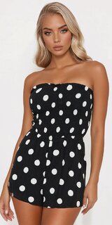 Tento krátky overal s bodkovaným motívom v čiernej farbe je nevyhnutným kúskom letného šatníka. Riasený dekolt sa dokonale prispôsobí postave, zvýrazňuje hornú líniu tela a poskytuje maximálne pohodlie pri nosení.
