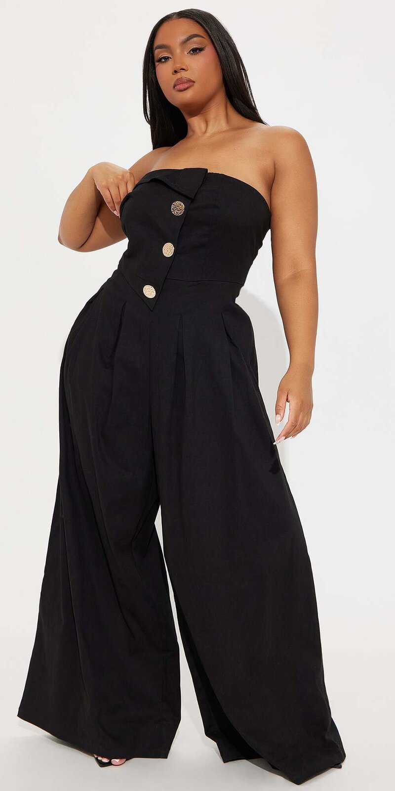 Čierny overal bez ramienok s asymetrickým výstrihom je nadčasovým modelom, ktorý sa stane centrom pozornosti na každej príležitosti. Jeho čistý dizajn dopĺňajú dekoratívne gombíky na prednej časti, ktoré mu dodávajú noblesný akcent.