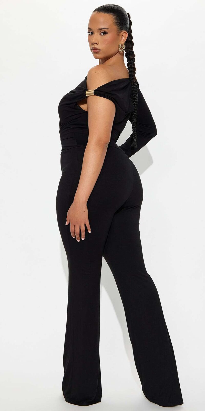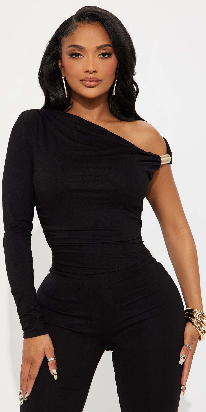 Tento čierny overal predstavuje stelesnenie moderného luxusu a ženskosti. Vďaka asymetrickému strihu na jedno rameno pôsobí výnimočne a dodáva celkovému vzhľadu odvážny nádych.