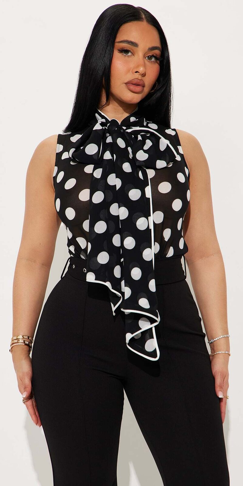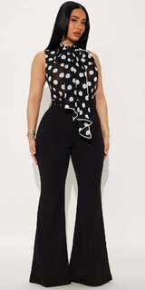 Čierny overal On The Dotted Line je moderným vyjadrením elegancie s nádychom originality. Viazanie pri krku pôsobí sofistikovane a dodáva outfitu jemne ženský akcent, zatiaľ čo kontrastné detaily z ľahkej látky pridávajú štýlový charakter.