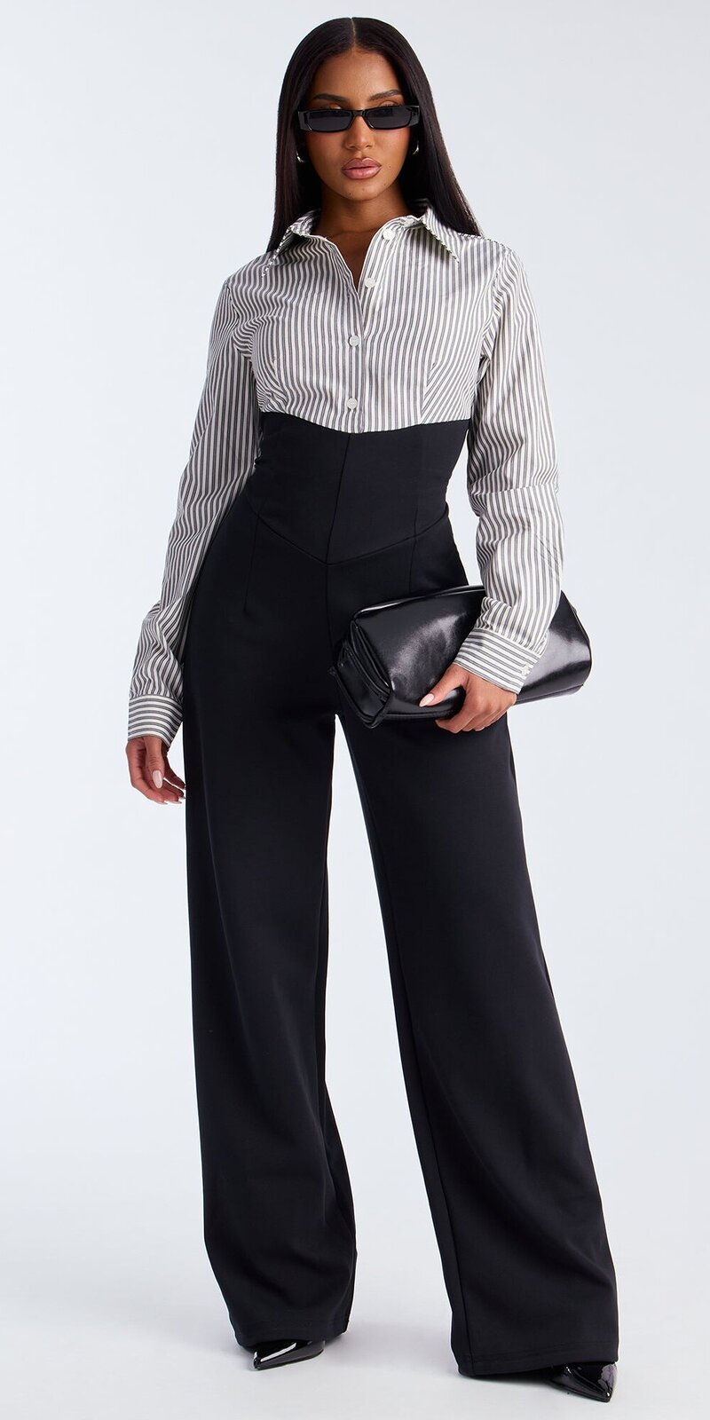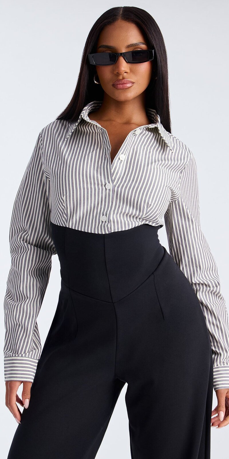 Overal Paola v čiernom pásikavom prevedení prináša prepracovaný biznis-chic vzhľad s nádychom ženskosti. Dlhé rukávy, zapínanie na gombíky a precízne tvarovaný pás vytvárajú lichotivú siluetu vhodnú na pracovné stretnutia aj spoločenské príležitosti.