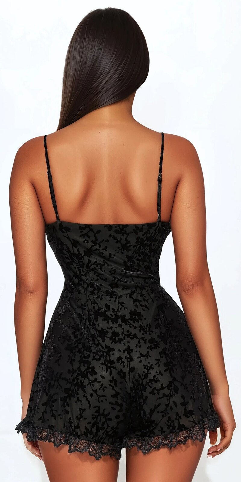 Tento čierny zamatový overal s kvetinovým vzorom je synonymom noblesy a zvodnosti. Materiál s efektom burnout vytvára polopriesvitný zamatový vzor, ktorý pôsobí exkluzívne a elegantne.