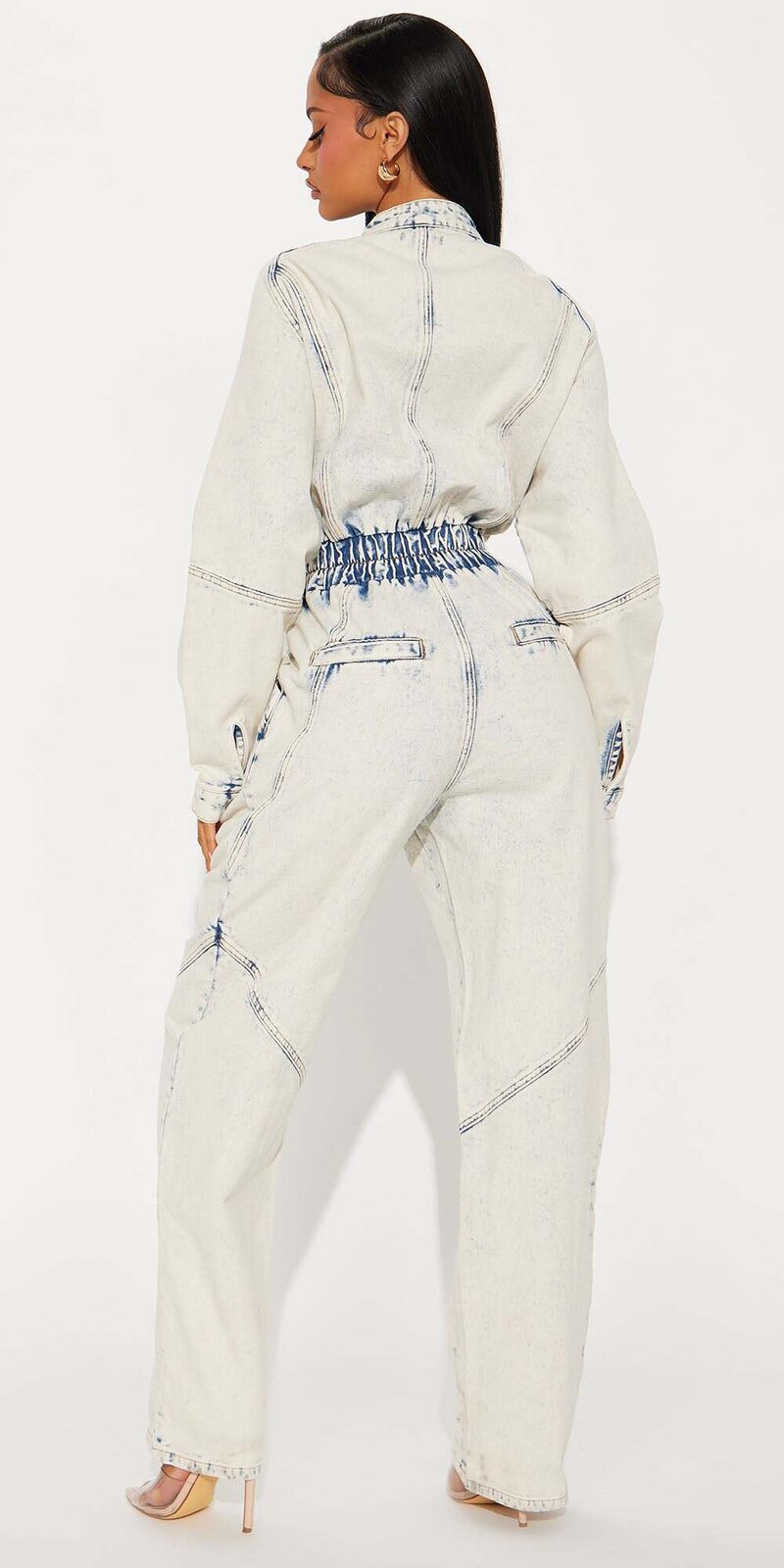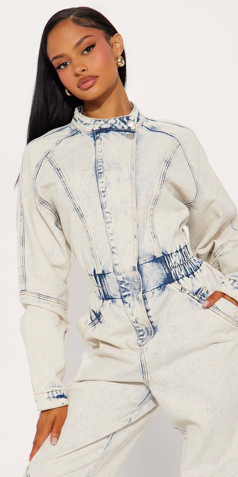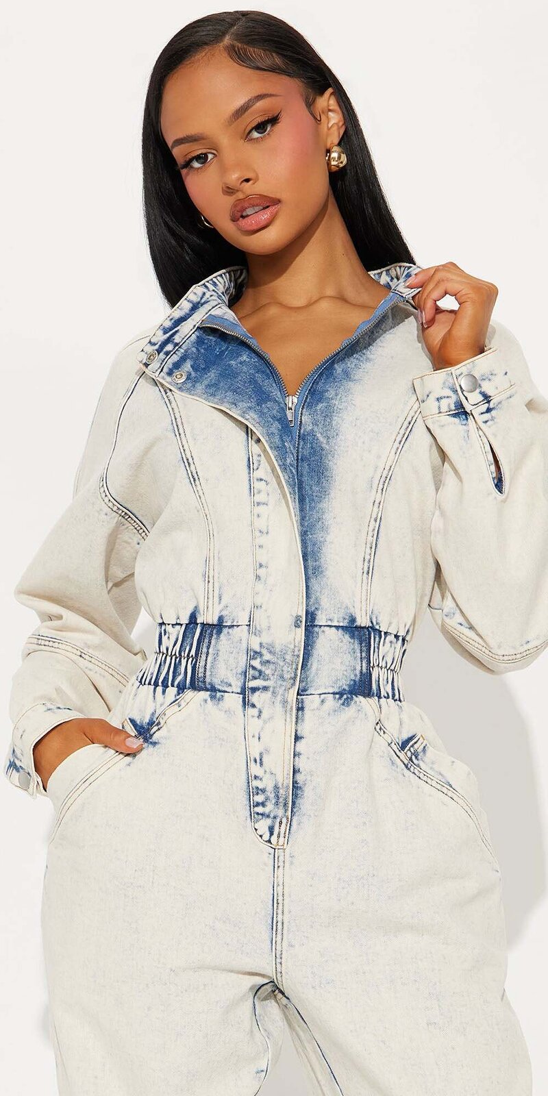 Tento rifľový overal v svetlomodrej farbe je moderným kúskom, ktorý spája praktickosť a módny vzhľad. Vďaka dlhým rukávom a zapínaniu na zips pôsobí ležérne, no zároveň elegantne.