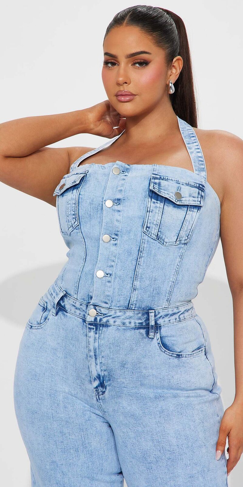 Praktické vrecká a halter strih zabezpečujú komfort pri každodennom nosení, zatiaľ čo jemne elastická rifľovina poskytuje voľnosť pohybu a príjemný pocit.