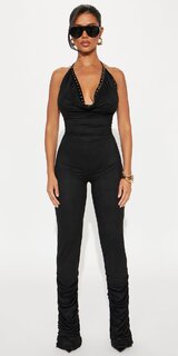 Elegantný overal s vrstvenými nohavicami v čiernej farbe