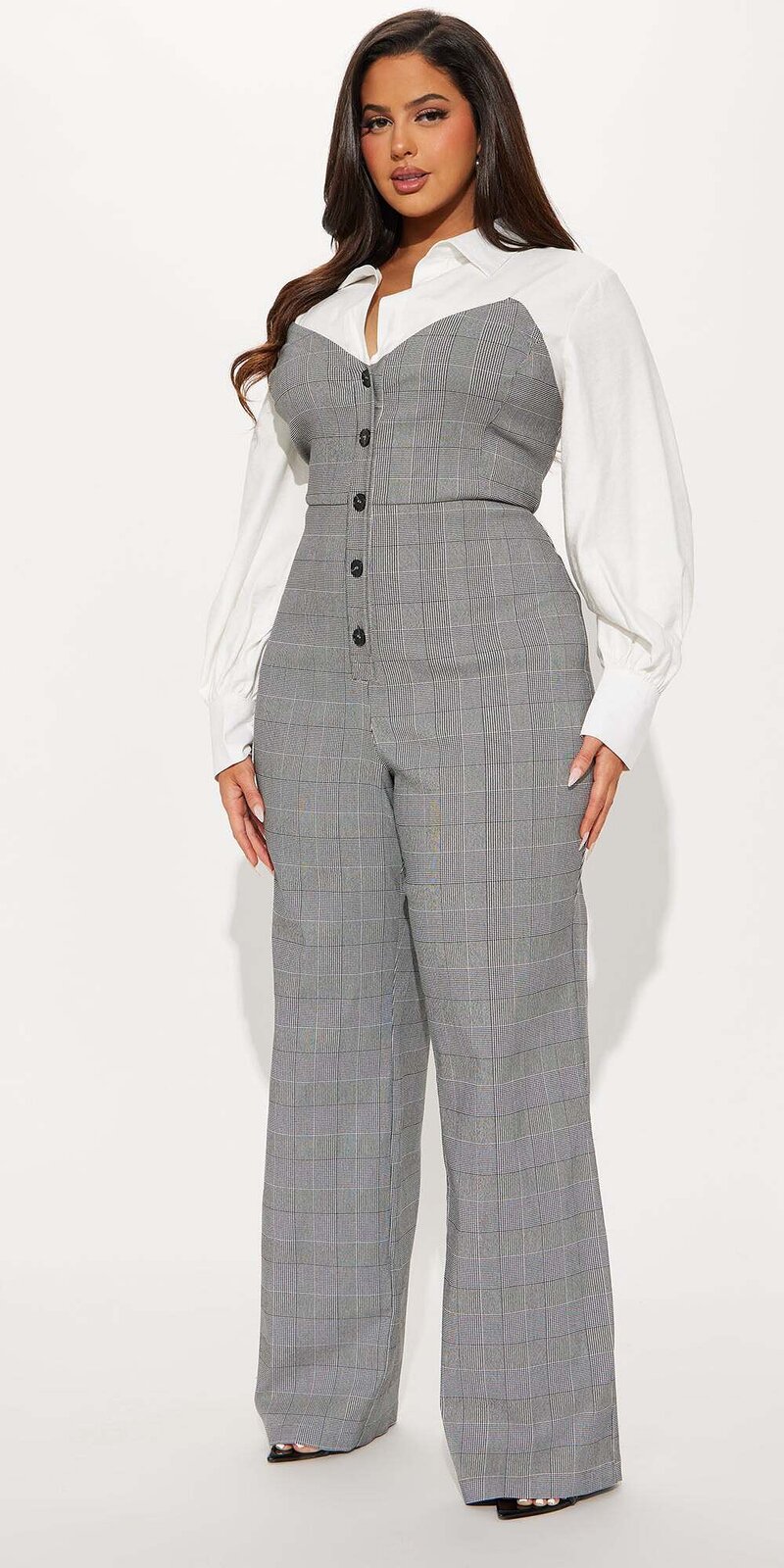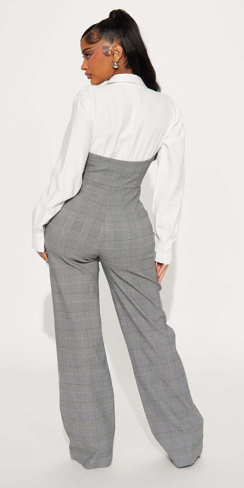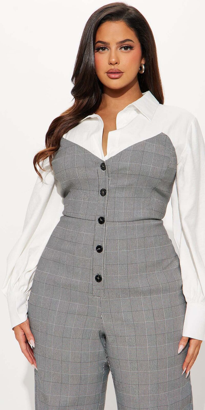 Trendy overal s výrazným károvaným vzorom v šedej farbe pôsobí štýlovo a sofistikovane. Golierový výstrih, zapínanie na gombíky a široké nohavice vytvárajú moderný, uvoľnený vzhľad. Elastický materiál je mäkký, pružný a komfortný na nosenie.