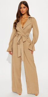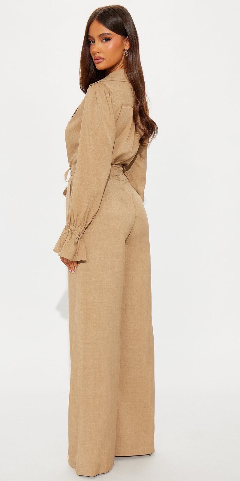 Dámsky overal Sereena v elegantnom khaki odtieni s dlhými rukávmi a viazaním v páse. Nohavice so širokým strihom vytvárajú vznešenú siluetu, zatiaľ čo hladká tkanina s jemným leskom pôsobí luxusne.