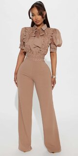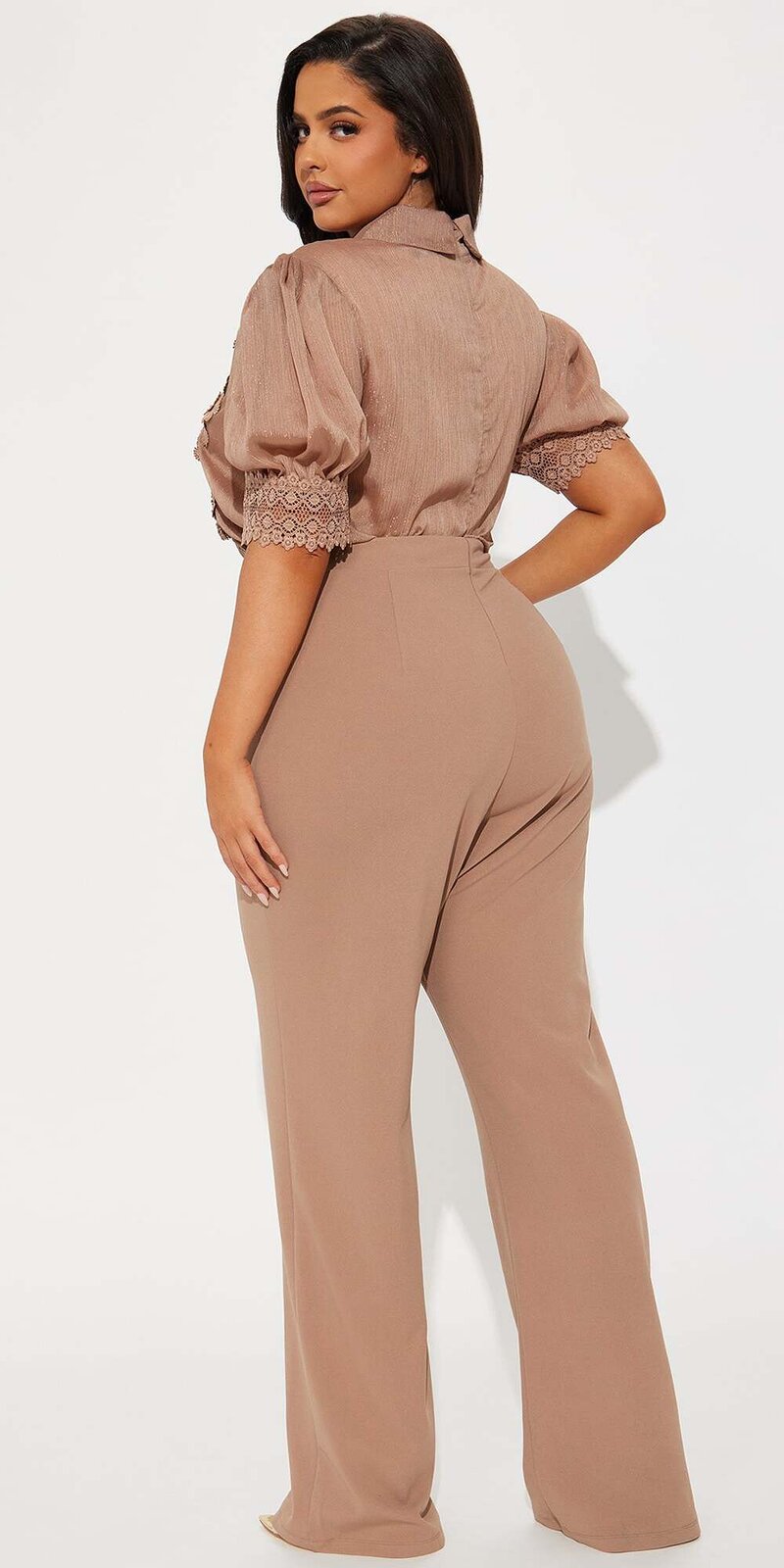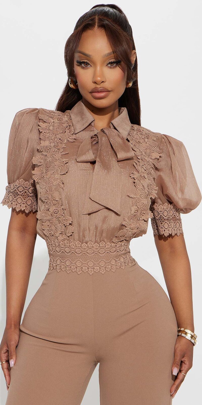 Elegantný overal v odtieni mocha s jemným čipkovým lemovaním a viazaním v páse. Luxusný kúsok, ktorý spája ženskosť a noblesu v modernom strihu.
